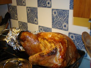 Going against the trend (based on the typical preference), our guests favored dark meat over white meat, so there was a lot of dark meat on the platter to see. Most surprising was just how dark the dark meat was. I don’t know whether it has to do with the leg muscles being well exercised as the turkey grazed in the pasture.