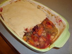 On a lightly floured surface, roll out the pot pie topping to the size of your baking pan. Place the topping over the filling. It doesn’t have to cover exactly.