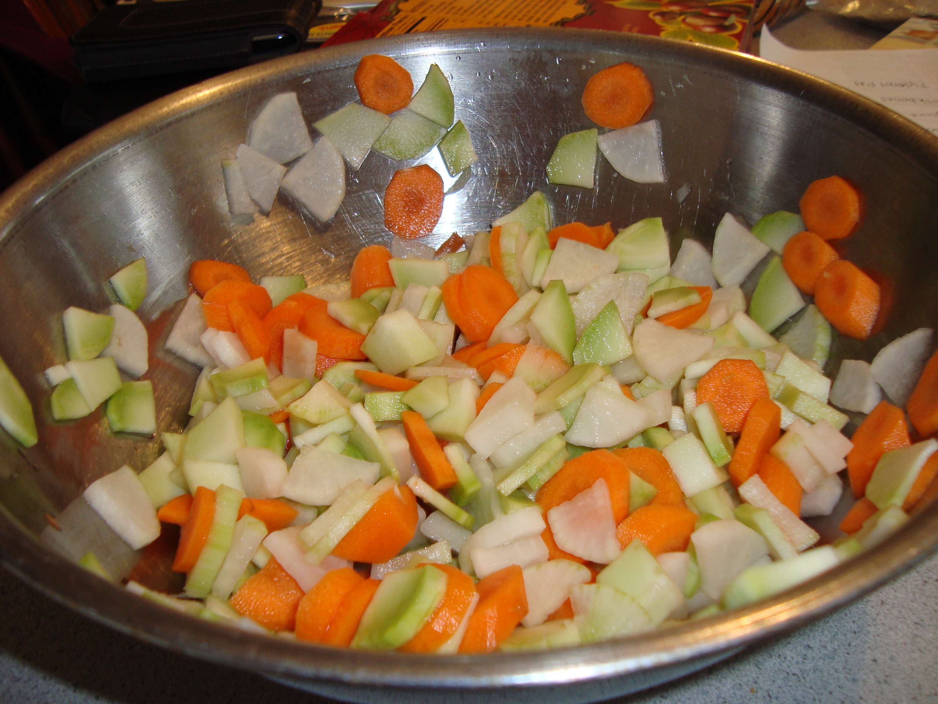 Prepare the vegetables. For broccoli stems and daikon, peel, quarter lengthwise, then slice thinly. Carrots can be treated the same, but don’t need to be quartered. Radishes can just be sliced. Turnips probably need to be quartered, depending on the width.