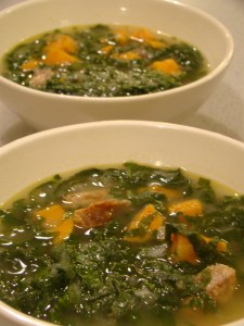 Howard commented on how this was the most local meal we’ve made in a while. The homemade chicken stock was stashed in the freezer. The onions and kale were from the past weekend’s farmers market, the potatoes and sweet potatoes were stored from our Winter CSA share, and the sausage was from Chestnut Farms.