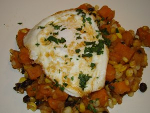 I made a tasty dinner on Wednesday: sweet potato, black bean and corn hash. It offered a whiff of summer. We had frozen the corn in August when it was at its best. We ate the hash with a fried egg on top. Why is that whenever a meal includes an egg, it seems like it should be breakfast? Breakfast, dinner, it was good both hot off the stove and again as leftovers.