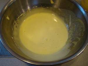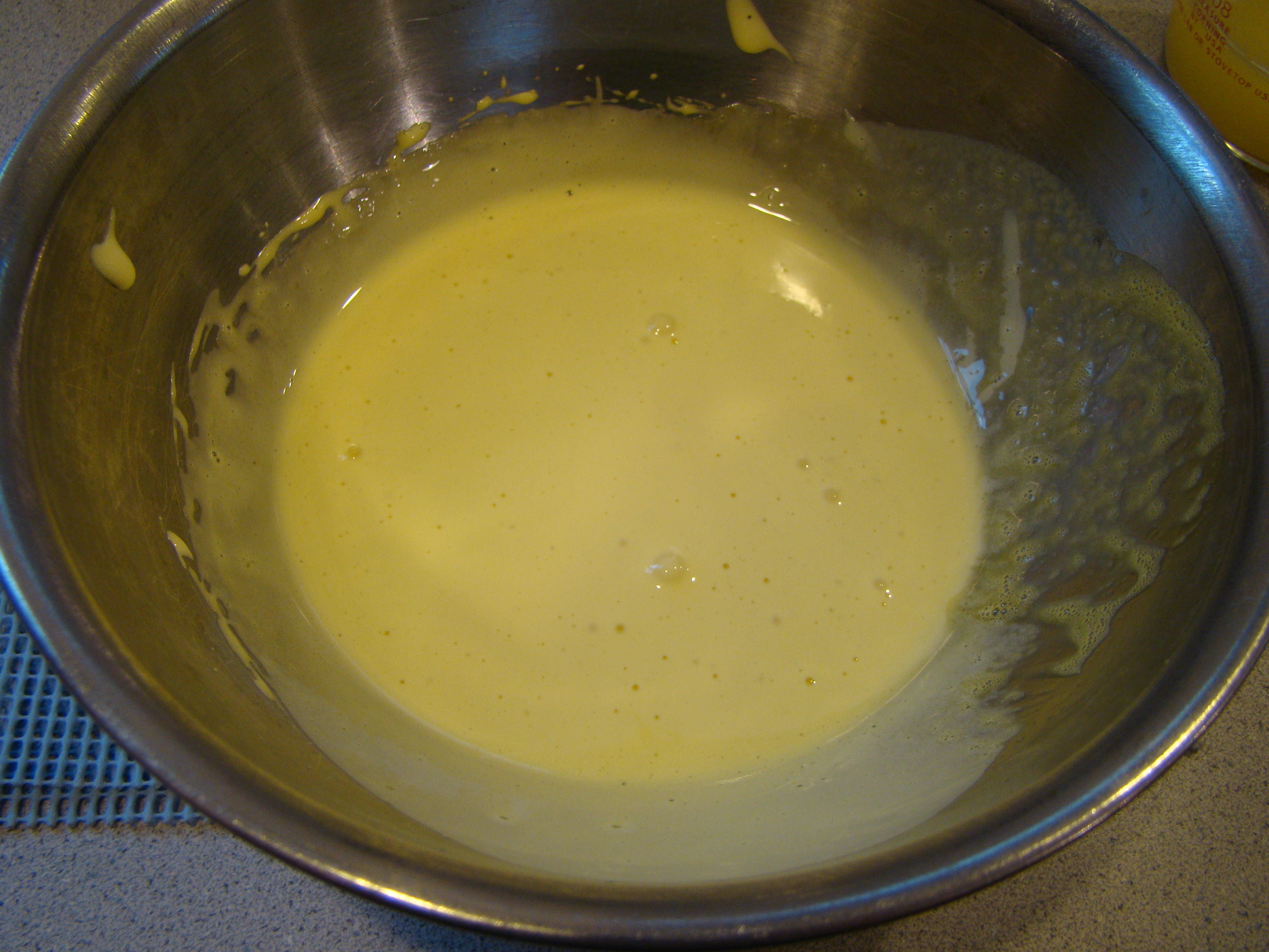 Preheat the oven to 350F. Beat the egg yolks with an electric mixer at medium speed for 5 minutes, until they are light yellow in color. Add the milk, juice, and zest, and beat until well blended.