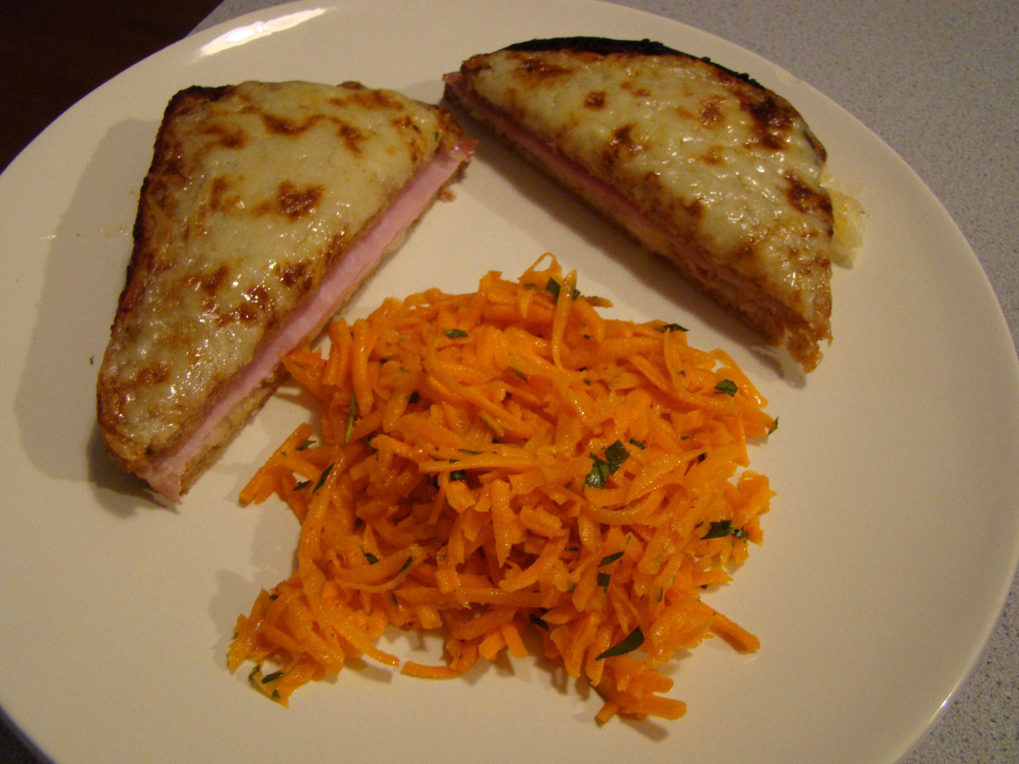 (We also made the Croque Monsieur (with ham) from the same No Take Out menu. We made them as directed, with cheese on the top of the sandwich. We also made them in the Panini press with the cheese on inside only. We preferred Panini-style. On taste, they got mixed reviews. I liked them, but Howard found flavor of the Gruyere cheese too strong. I also spread the cheese on both sides of a hamburger bun when we had burgers for dinner this weekend. I liked that too, sort of a French cheeseburger.)