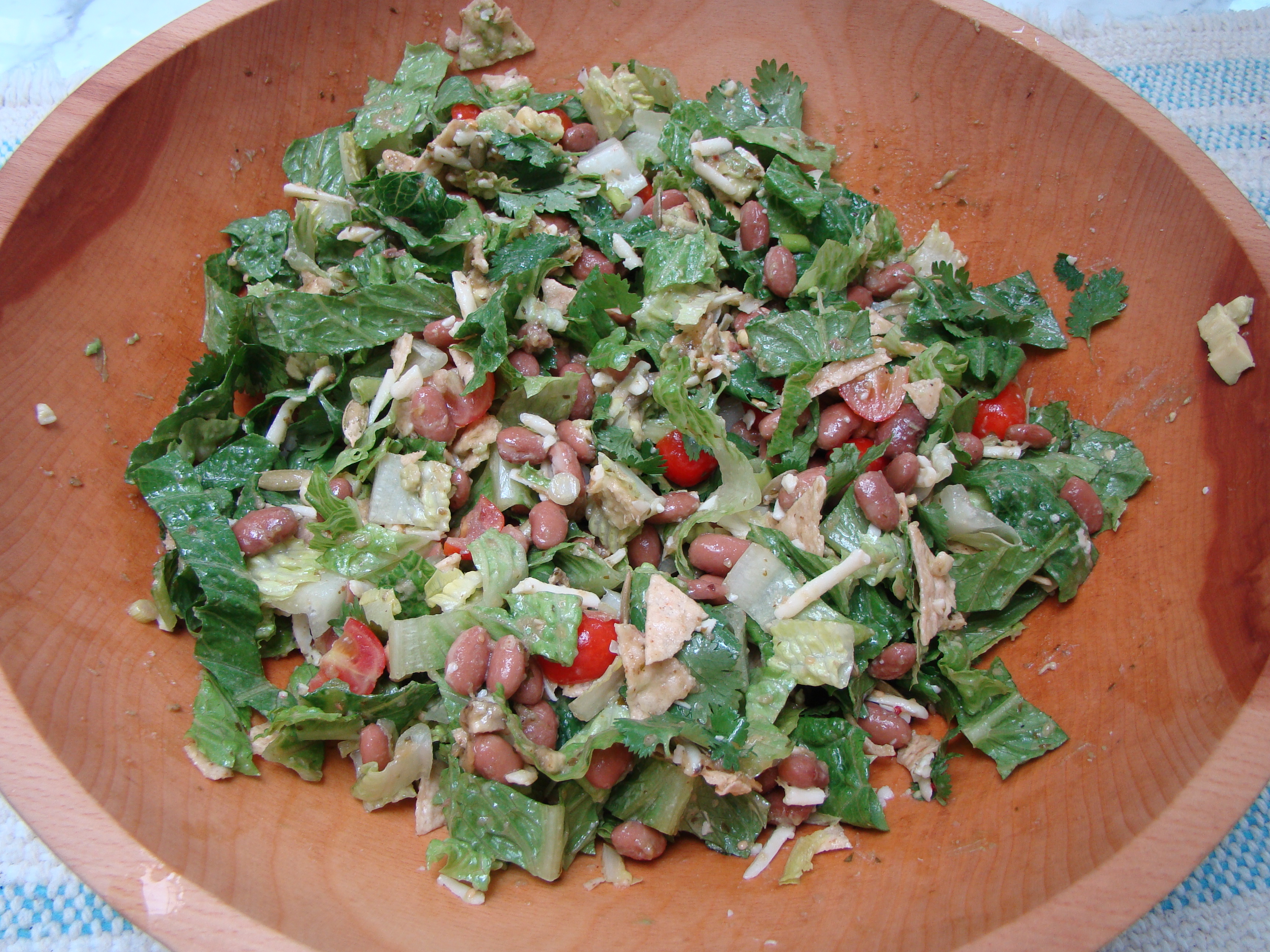 Many of the ingredients in my pantry and refrigerator lent themselves to Tex-Mex flavors. That means that taco salad doesn’t require much advanced planning. It’s really more of an idea than an exact recipe. You just make it with what’s on hand. If you don’t have something, leave it out. If you have something else that appeals to you, add it in. I usually make it with as a vegetarian salad with beans, but you can add or substitute chopped chicken or fish if you have it.