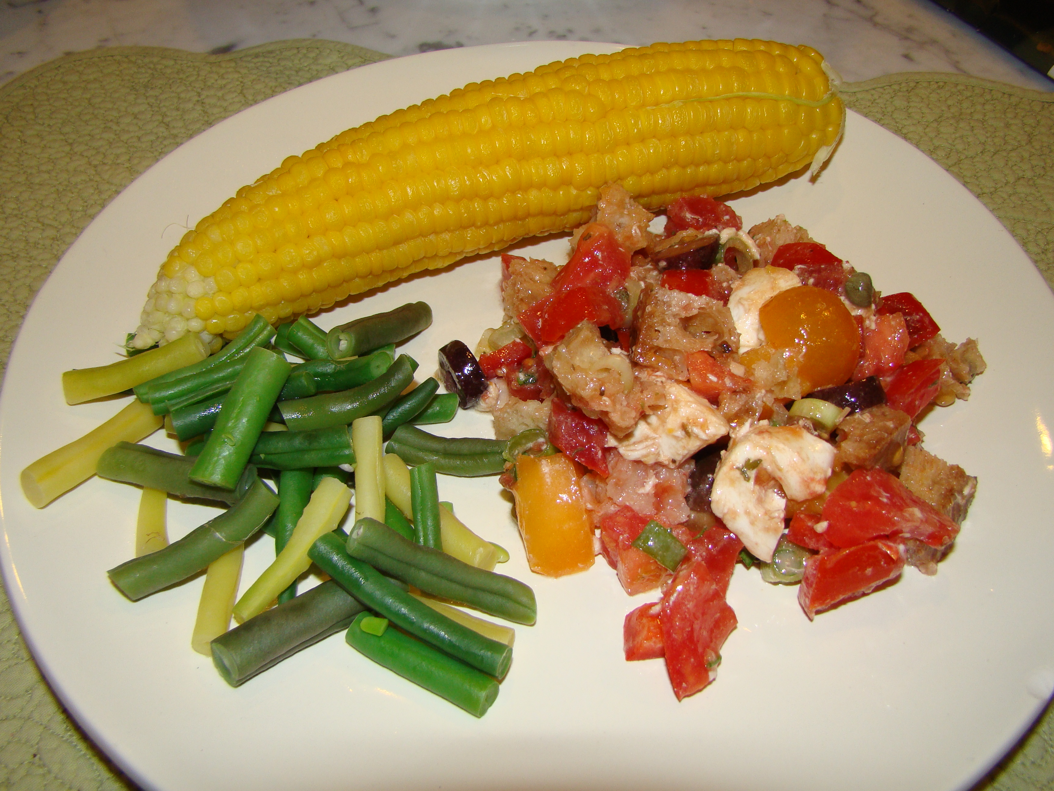 For dinner, we had what Howard calls a “grazing dinner”, which is a simple meal of fresh vegetables and assorted odds and ends we have in the refrigerator or pantry. Tonight, we dined on fresh ears of corn, steamed beans, and an impromptu bread salad.