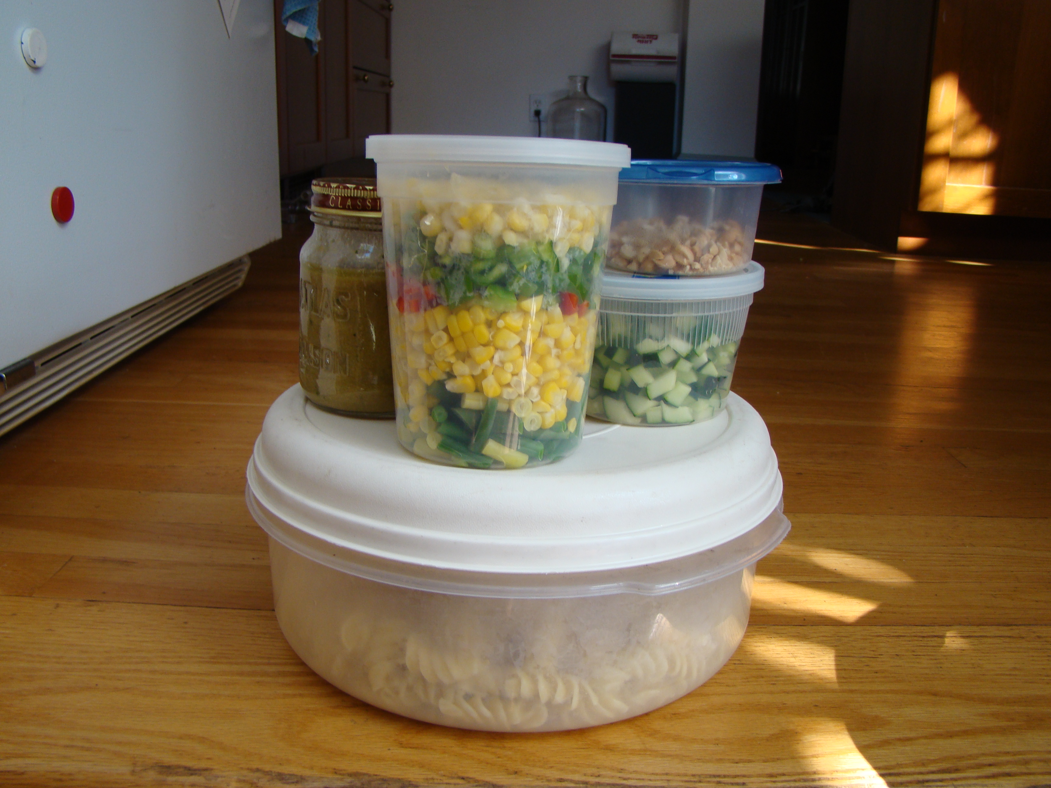 I thought it worked out well. I tossed the cooked pasta with some oil so it wouldn’t clump together during the day. I cooked and chopped the vegetables and stored them in a separate container. I put the chopped peanuts in another container and the dressing in a jar. All of this fit into a large canvas bag that I could stash in the office refrigerator for the day, then carry to the party and toss together there.