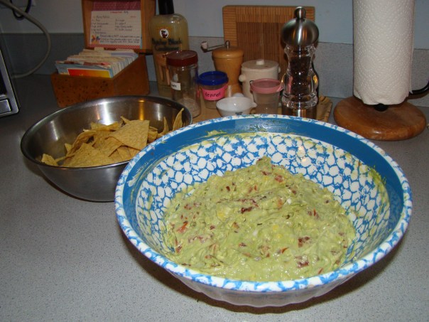 We discovered a new guacamole recipe that seems to be a winner. I am almost embarrassed to admit that, when we made it last weekend, after consuming the entire bowl, we decided that we should skip dinner. We made it again this weekend, to bring over to Laury and John’s when we went for dinner Sunday night.