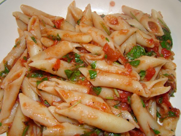 With all this activity, the cupboard has been pretty much bare. After a weekend of eating way too much, we really needed a home-cooked meal. I managed to pull this spicy pasta together from the pantry, loosely inspired by a recipe for Pasta Arrabbiata from a Rachael Ray cookbook (Just in Time). I didn’t have the exact ingredients, but the end result wasn’t bad.