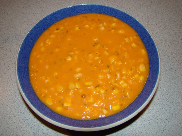 To start off the week, I also made a pot of soup. This is one of the late-season tomato soups that I saw in the Boston Globe magazine a few weeks ago – the Roasted Tomato Bisque with Corn and Basil. I’d give the soup mixed reviews. The bisque itself was excellent! I thought six cups of corn was too much. If I make it again (next year, corn and tomato season is pretty much over) I would use half the corn.