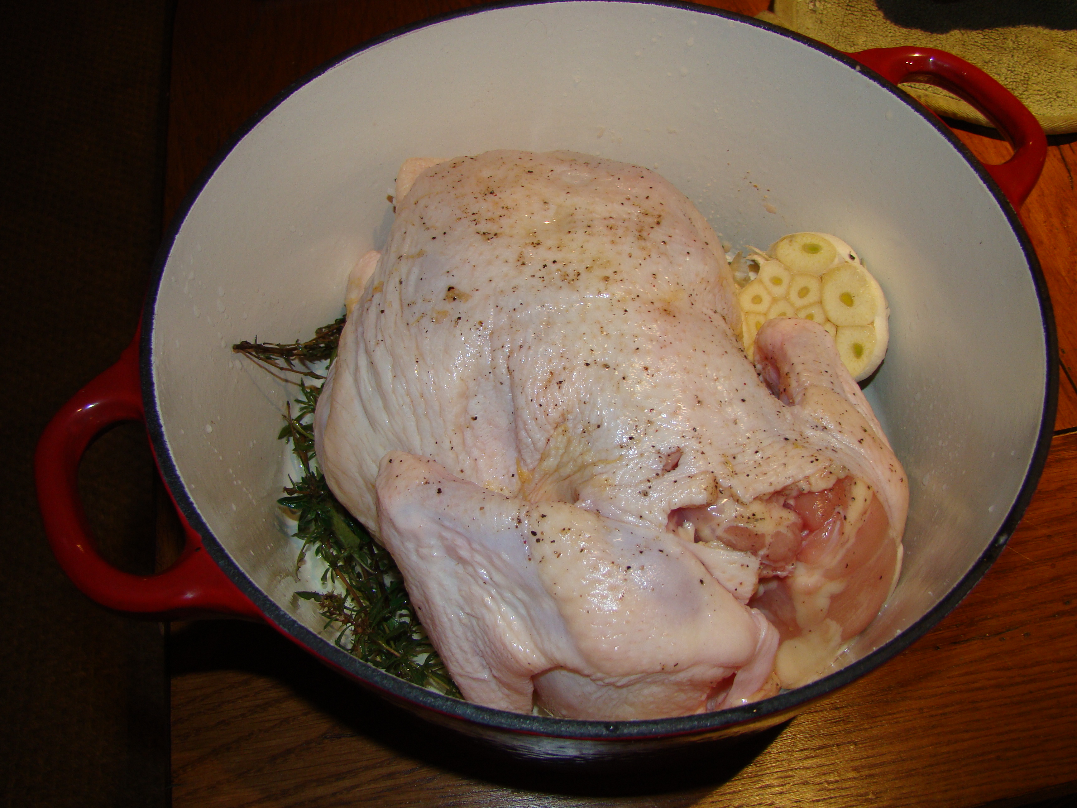 Dorie’s recipe is so much easier. You stuff the chicken with garlic and herbs. The chicken gets propped up off the bottom of the pan by some bread slices. Accompanying vegetables, and more garlic, roast along with the chicken in a Dutch oven, keeping most of the splatter in the pot.
