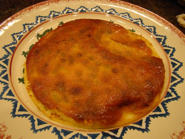 As for the cooking itself, I had no trouble with the caramel, but as I said, I’ve done that before. Jane’s pots are all Calphalon, so I had to dab the caramel on a white plate to track the color change. It’s definitely easier with stainless-steel colored pots. I think I should have doubled the caramel topping. Jane did have an 8-inch cake pan, and though the heated pan spread the caramel easily, it didn’t completely cover.
