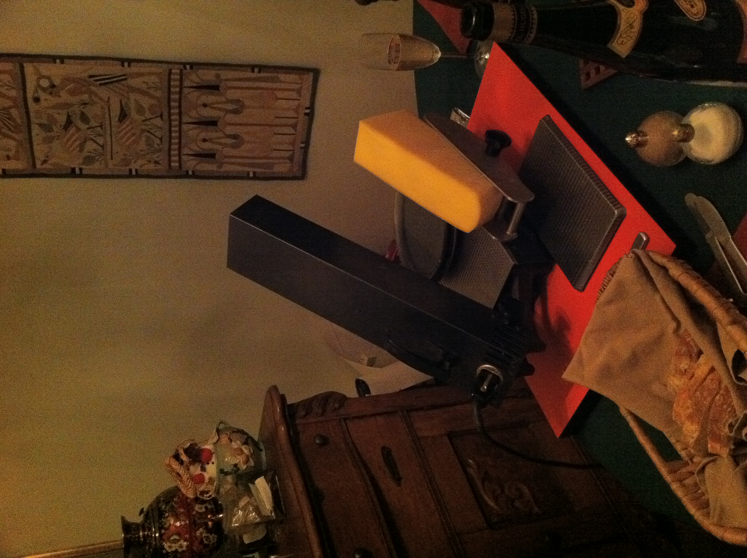 Raclette is a semisoft cow’s milk cheese, mildly stinky with a slightly nutty taste. Laury had a special Swiss machine for melting it, the same one her family had during her childhood. You start with a big block of cheese (they bought a 3 pound hunk). The raclette machine has a serious heating element that can be moved back and forth so you can control the melting. When the heating element is over the cheese, it slowly melts. The cheese sort of rolls down onto the waiting plate (a special raclette plate, according to Laury). We scraped it off to help it along. I read that raclette comes from the French word racler, which means to scrape. The rind was an extra-special treat as it got toasty.