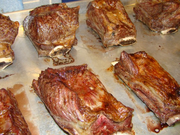 Short ribs are a relatively new addition to our eating repertoire. Howard has made them several times in the sous-vide contraption he rigged up from old lab parts ordered on eBay. His version is very scientific (that’s what you get when a molecular biologist plays in the kitchen). It involves cooking the browned short ribs, vacuum-sealed with sauce, in a 133-degree Fahrenheit water bath for 72 hours. More on that another time.