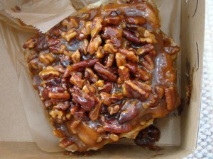 After about an hour, we had exhausted the museum, and it was time for more sustenance. There is a Boston-area bakery called Flour that is getting wider attention since the owner Joanne Chang published a cookbook recently. I have never been able to arrange a Boston-centric outing that included a visit to a Flour location, though I’ve longed to. Well, even though Central Square never used to be anywhere that the word “upscale” would apply to, the newest Flour location opened in Central Square over the summer. We wandered a few more blocks down Mass Ave to check it out. It was a vibrant, hopping place. We picked up a variety of treats (for later): a whoopie-pie like Oreo, a cheddar-scallion scone, and a pair of the famous Sticky Buns.