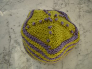 My niece Rachel asked me to knit her a hat. She’s a girl after my own heart. She requested a hat that was lime green and light purple, a perfect color combination in my opinion. I’ve made Rachel several hats since she was born (she’s 8). It was years before her mother, my sister Jennifer, told me that all the hats I had made for her were too big. The two I made when she was an infant didn’t fit her until she was 5. My biggest worry was that I wouldn’t get the circumference right (yes, my sister did send the measurement of her head).