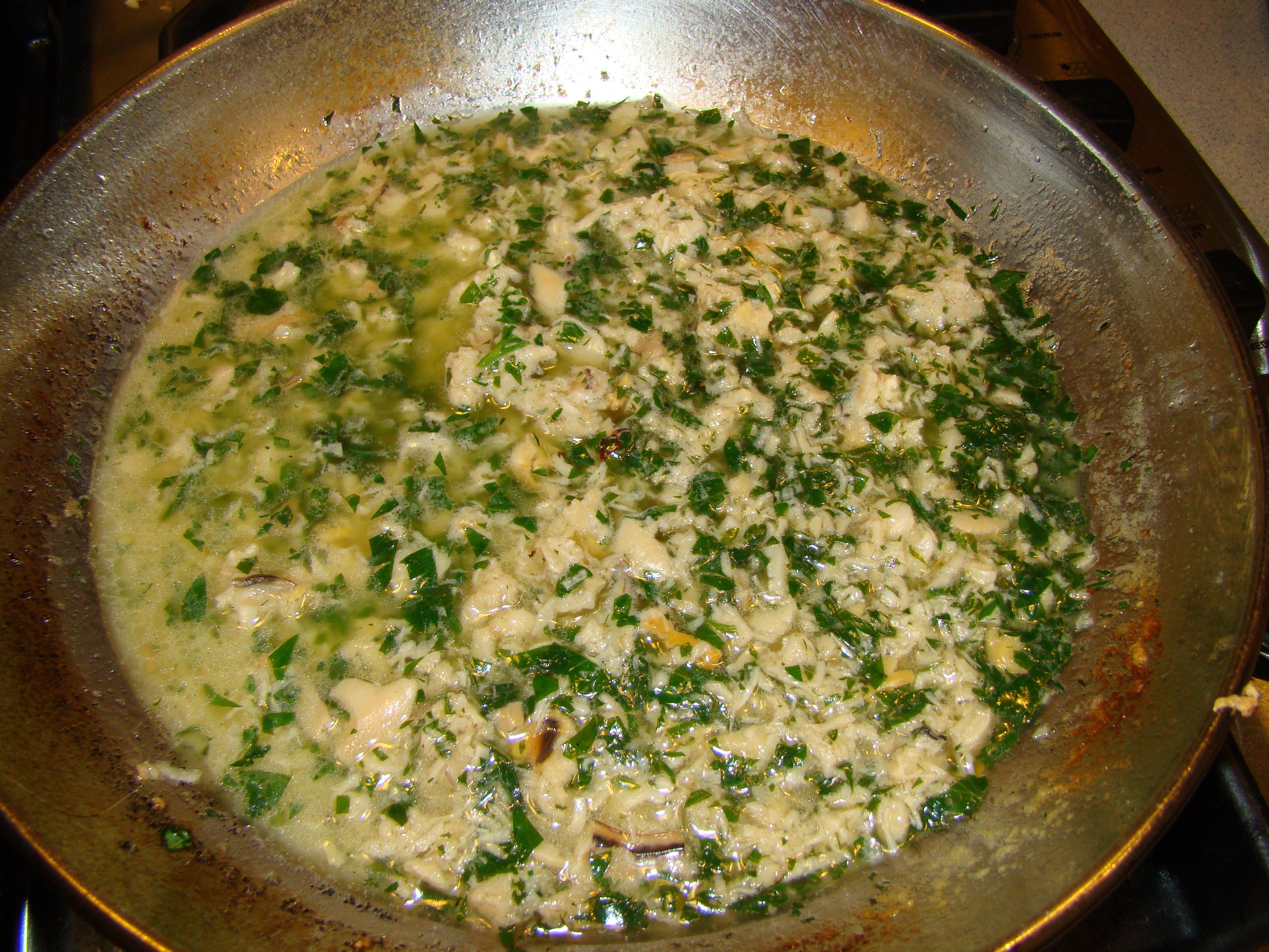 Heat the butter and olive oil over medium heat until the butter melts. Add the minced garlic and sauté until the garlic is golden, but be careful not to burn it. Reduce the heat if you need to. Add the white wine and clam juice. Bring to a boil, reduce the heat, and simmer for 10 minutes. Stir in the parsley and the chopped clams. Simmer for 3 minutes to heat the clams through. Season generously with freshly ground pepper.