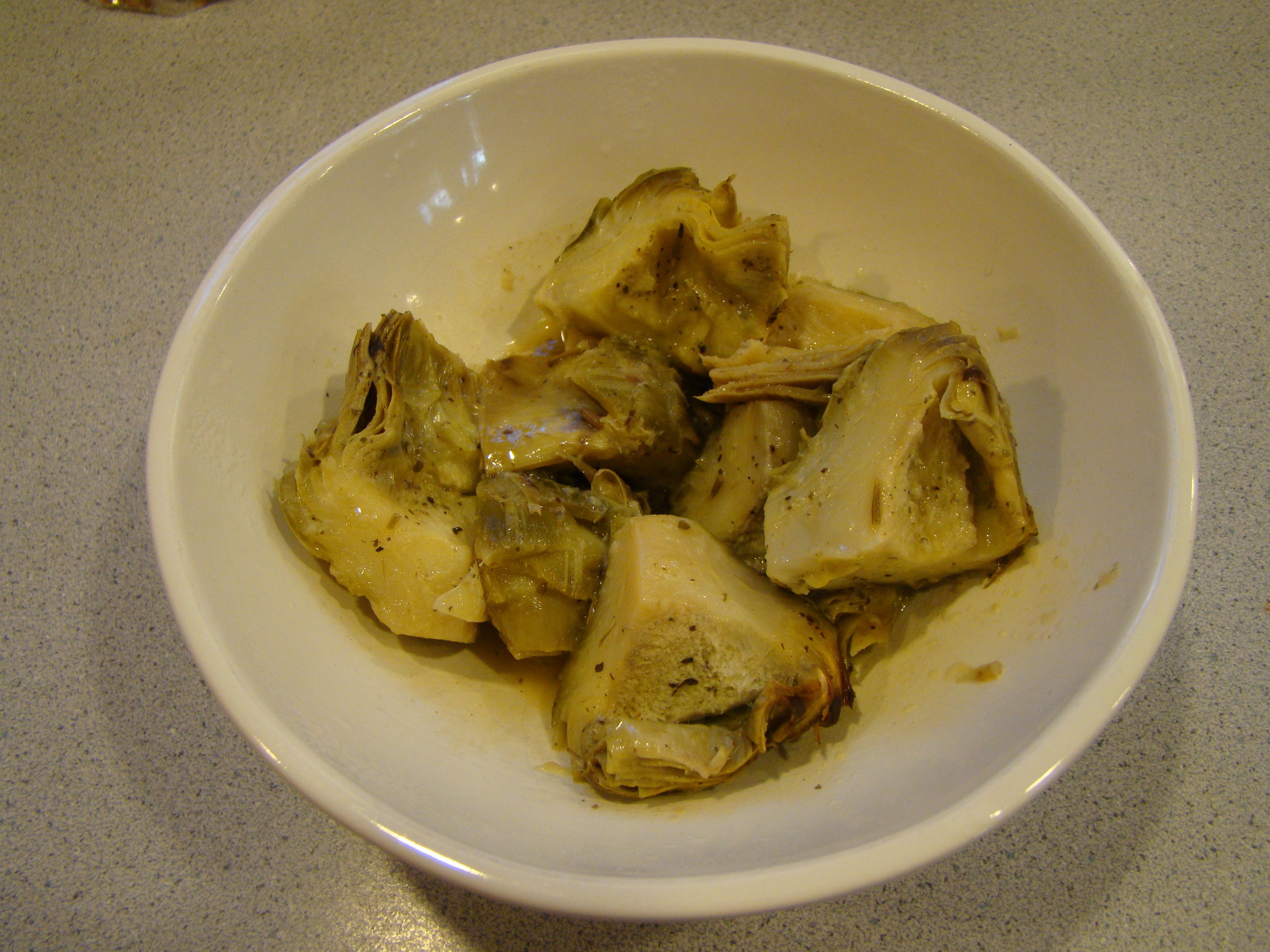 Our local farmstand had lots of frost-kissed artichokes on the seconds shelf. The outside of the artichokes were not so pretty, but, for this recipe, the outer leaves are stripped off and only the hearts are used. Also, at 50 cents apiece, they aren’t as costly as their less-blemished cousins.