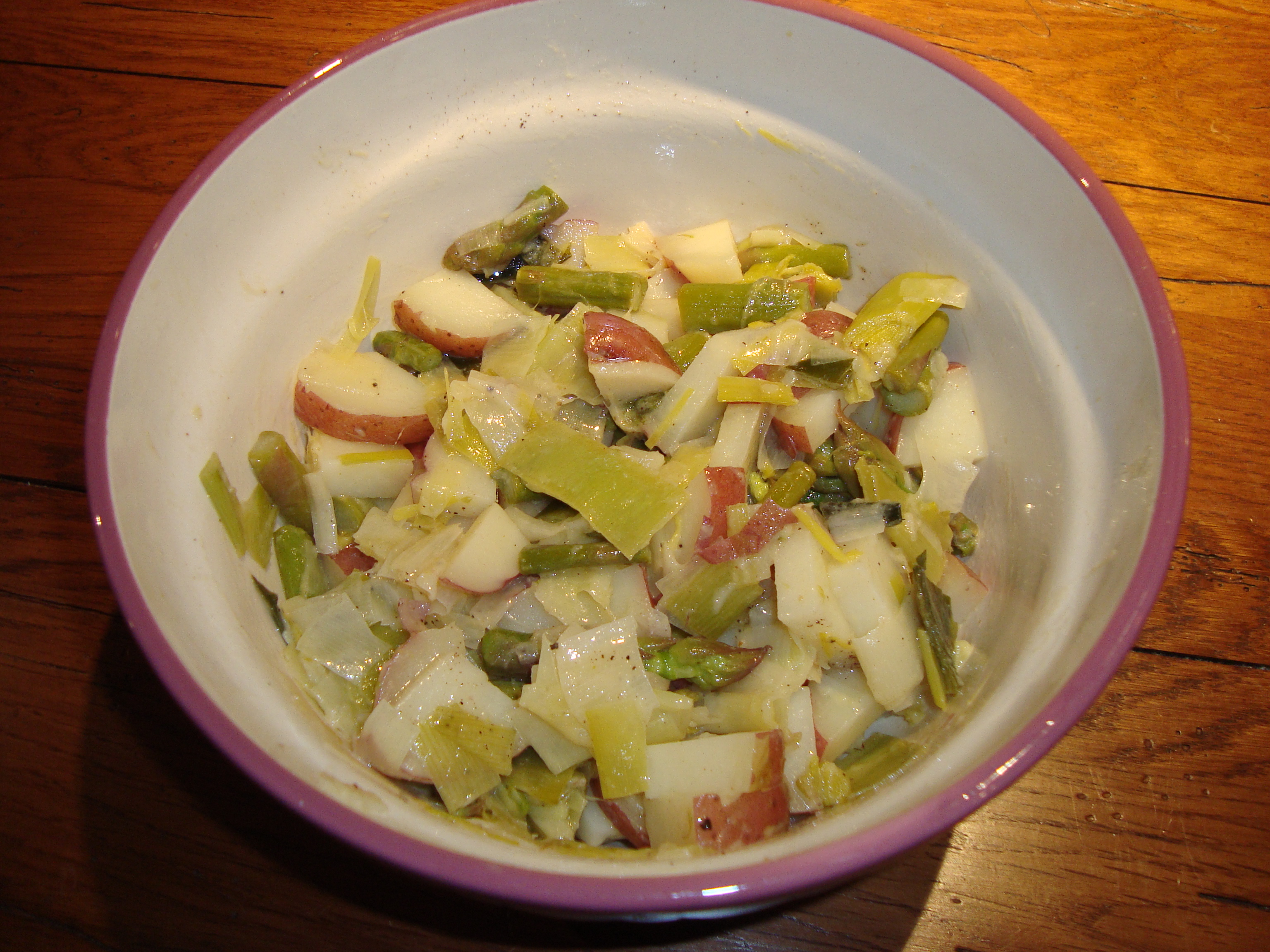 The first salad is a favorite spring-time potato salad, best served warm. It is a sort of mixture of potato salad with leeks vinaigrette. When asparagus is in season, it’s a must. I love the combination of the sharp tang of the mustard, the silky leeks, the grassy asparagus, and the earthy potatoes. The color is also a great green.