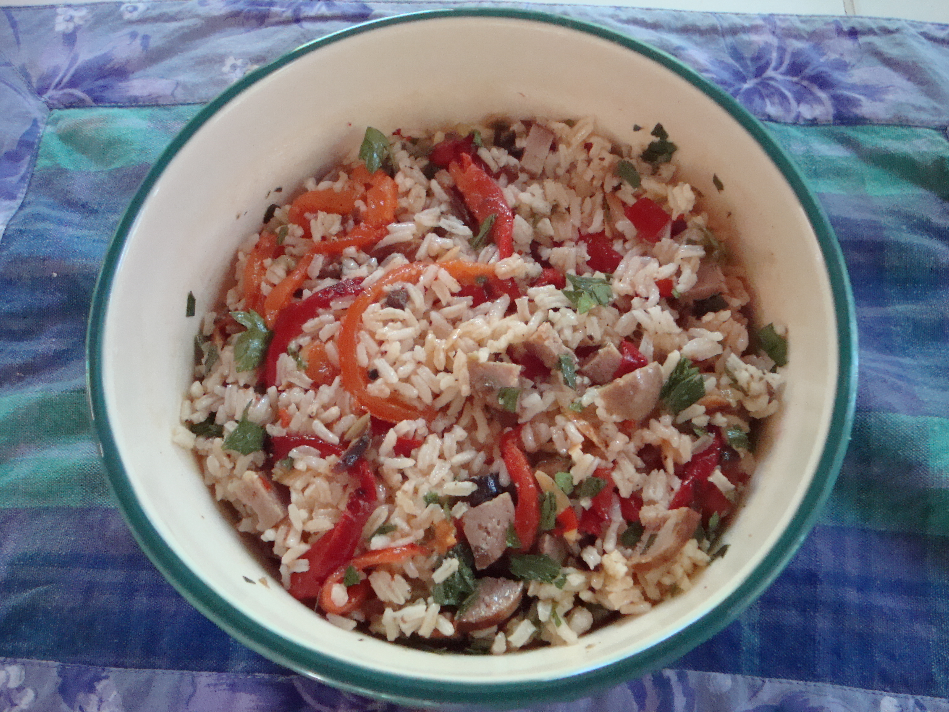 Howard had grilled some sweet Italian sausages, so I used one link in a Spanish-inspired rice salad. Short or medium-grain rice, like arborio, would have been even better, but my Maine pantry isn’t as well stocked. This could be a side dish, though we ate it as the main event for lunch one day.