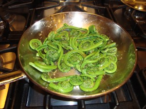And, finally, the fiddleheads. These are a special treat, so they called for a simple preparation that wouldn’t overshadow the vegetal flavor of these ostrich fern sprouts. I just parboiled the fiddleheads, drained them and dried them, then did a quick sauté in with minced garlic. I find the flavor of fiddleheads to be mildly reminiscent of asparagus, but not exactly. If you’ve never had them before, I recommend that you look out for them next spring and try them!