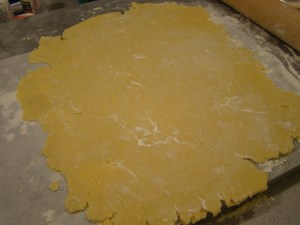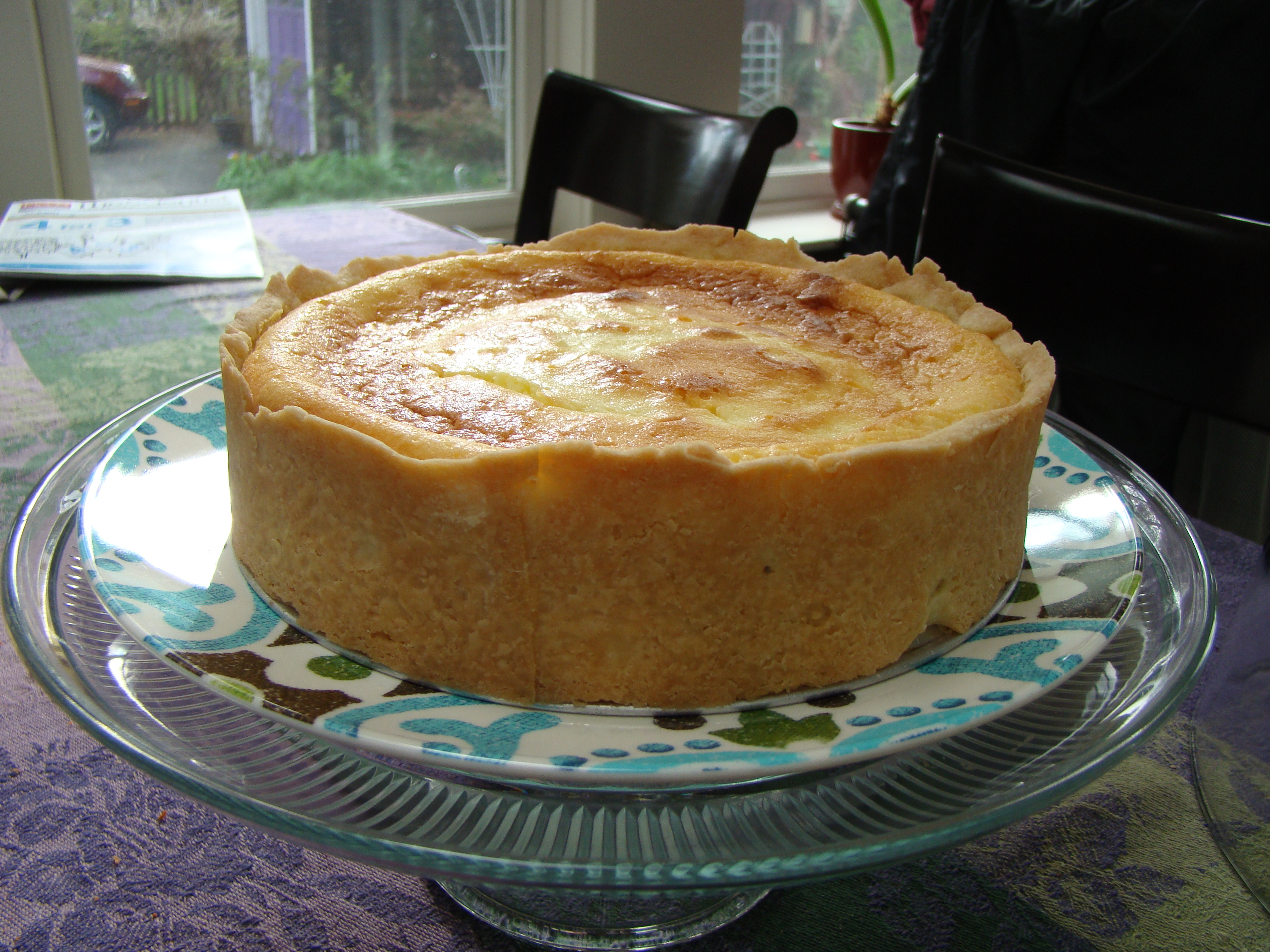 I had trouble with the sweet shortbread-like pastry crust. When I made the same pastry for the Orange-Almond Tartlets, I pressed it in the shell and it worked perfectly. For this recipe, I refrigerated it overnight and then rolled it out. The pastry wasn’t very cooperative. It kept crumbling as I rolled it. I tried patching it with wet fingers, but it kept on cracking. I ended up with a shaggy square so I used a dinner plate to make a nice circle. Then I was faced with the challenge of how to transfer the fragile sheet of dough to the pan. It didn’t make it one piece, so I had to do still more patching in the pan. Fortunately, while more difficult to work with than I remembered, the pastry was also extremely forgiving. Despite all the handling, the pastry didn’t turnout tough at all.