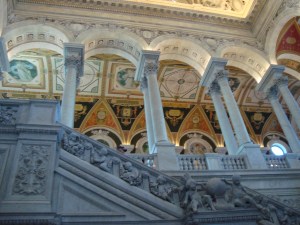 - Library of Congress: I had never visited before. The Thomas Jefferson building was a marvel in decorative arts. My jaw dropped just walking into the Great Hall. The library was built between 1888 and 1897, in the Italian Renaissance style, mostly from stone and metal to limit the risk of fire. The architect in charge hired 50 American artists, many discovered at the 1893 Chicago World’s Fair (the Columbian Exhibition), to adorn the library’s interior. Every surface is carved or painted with every sort of symbolism to honor knowledge, printing, the arts, and the burgeoning nation.
