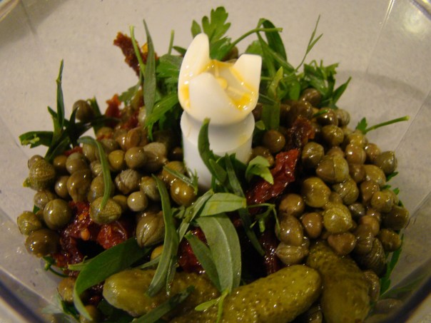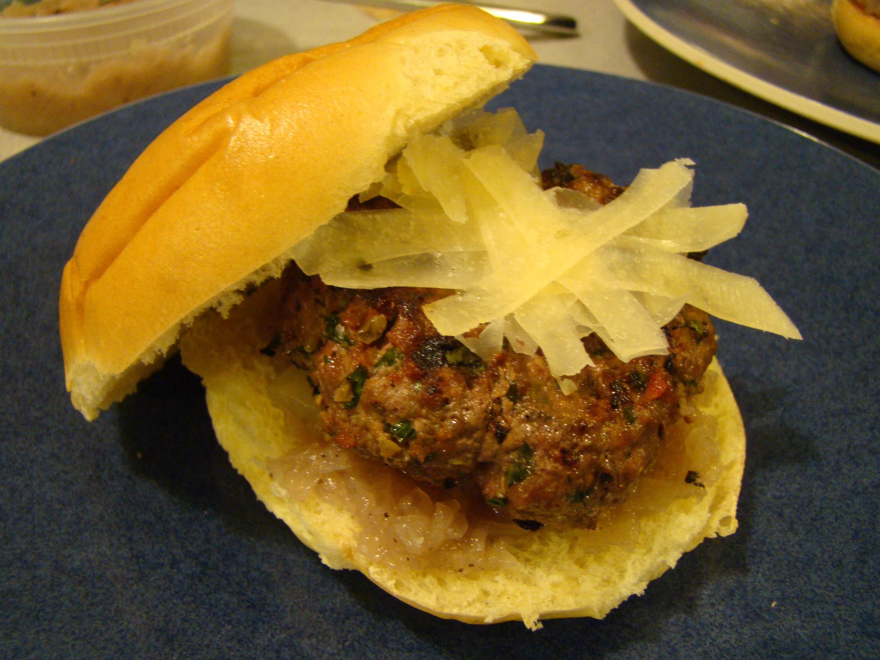 This recipe was quite simple: a dressed-up hamburger. A variety of aromatics were mixed in with the ground beef. The sun-dried tomatoes, capers, cornichons, and fresh herbs dotted the meat with lovely flecks of red and green. The grilled burger was nestled in an eggy role and layered on a bed of homemade onion marmalade and sliced pickle and topped with coarsely grated Parmesan.