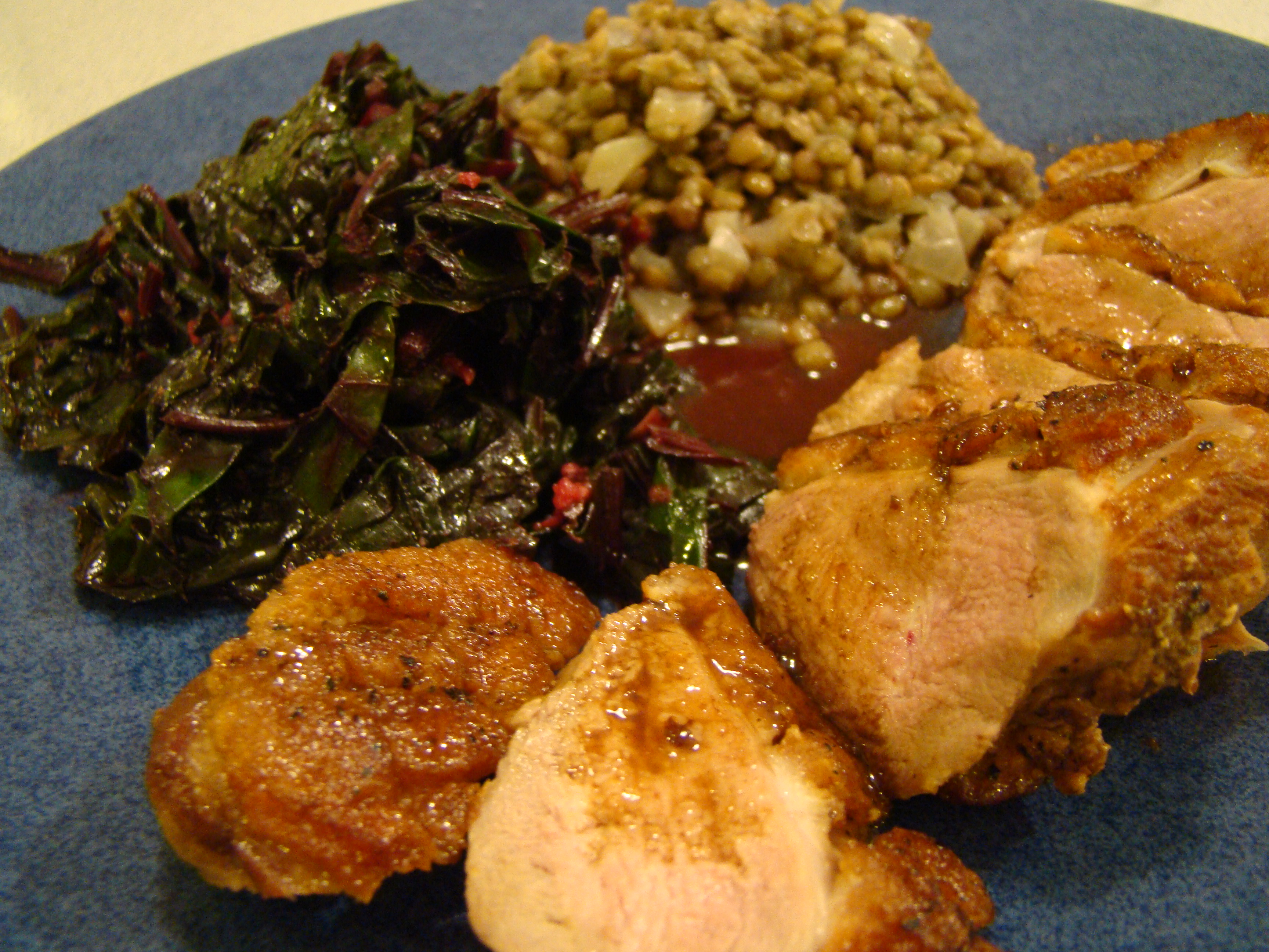 For serving, I sliced the duck (on the diagonal to make it more tender, according to Dorie) and drizzled the slices with sauce. To me, lentils are the perfect side dish for duck, so while my duck cooked, I simmered a pot of lentils. I tossed the warm lentils with a mustard vinaigrette. Sauteed beet greens rounded out the plate.