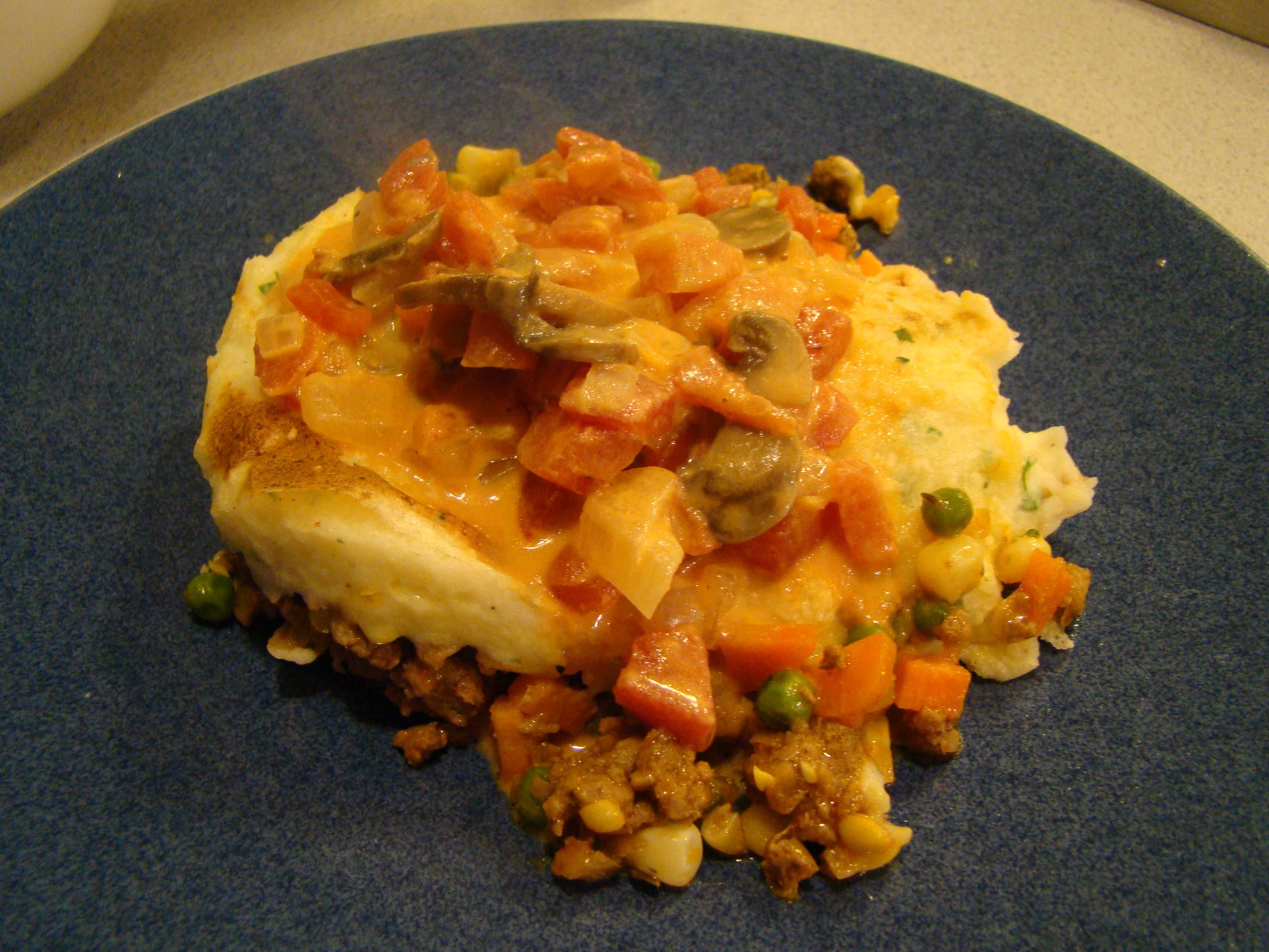 Hachis Parmentier doesn’t typically have vegetables in the filling, so I made it my own by using a little less beef and adding corn, peas, and carrots to make up the volume. I loved the smooth mashed potato topping. An interesting creamy, tomato-mushroom sauce turned this sometimes ordinary casserole into something special. It was delicious!