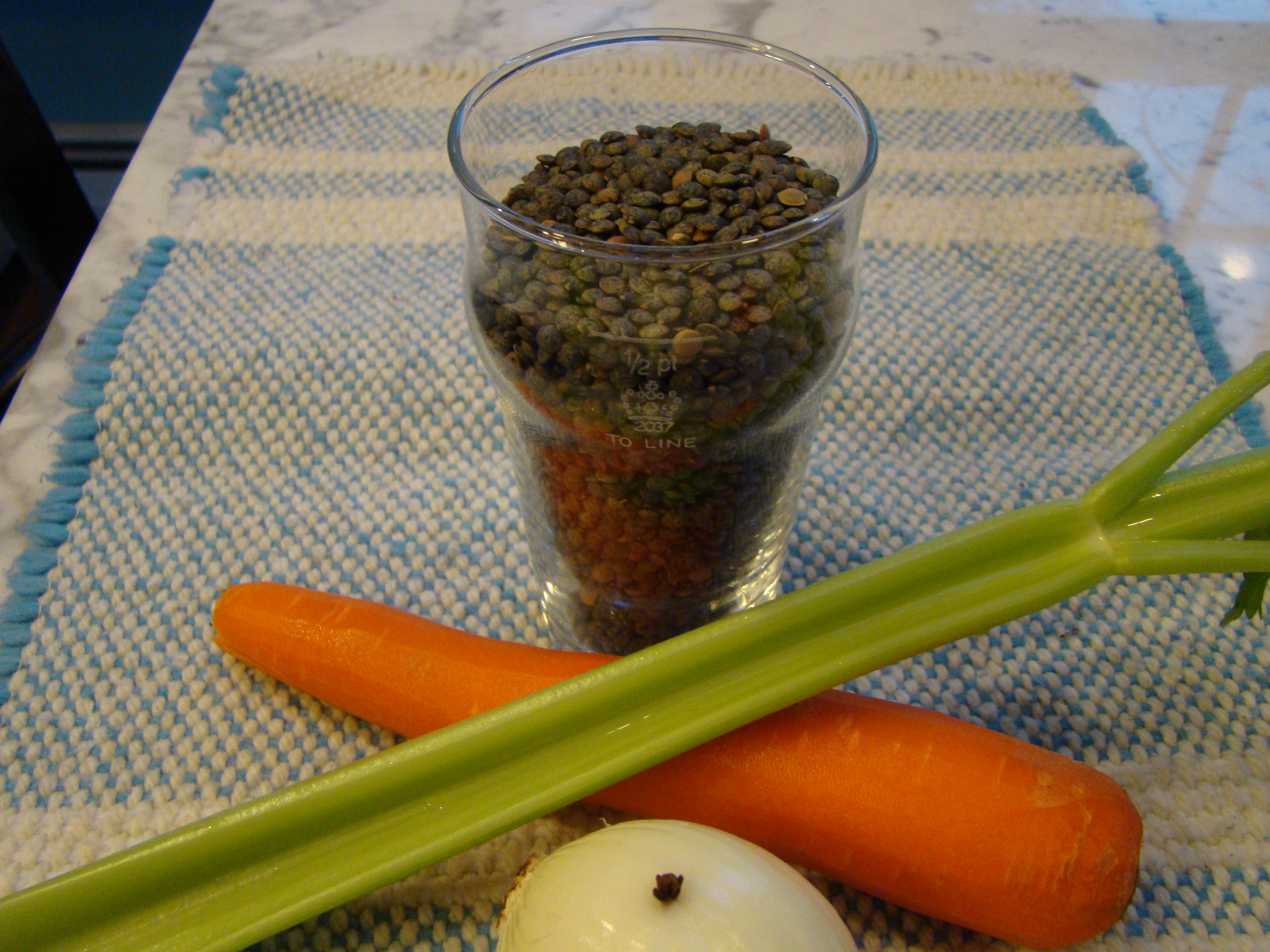 I normally just cut the aromatic vegetables into bite-sized pieces and cook them with the lentils, but by the time the lentils are tender, the vegetables dissolve into oblivion. Cooking large pieces of the vegetables with the lentils and then chopping them up afterwards worked out really well. Also, pureeing some of the lentils to thicken the lentil mixture added a nice creamy texture to the final dish.