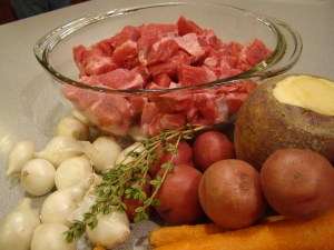 After a quick dinner out, we stopped at the grocery store near my house (different chain) to get a new round of lamb. I can tell you there was quite a bit of sniffing the plastic before going to the register. At home, I still wanted to make this before bedtime as there’s no way I’d have enough time after work later in the week, so I set to it, with my helper Howard chopping vegetables while I boned the lamb shoulder chops for the stew.
