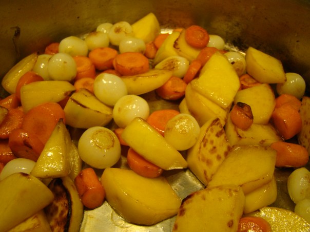 Once the meat was cubed and browned, a little flour, beef broth, garlic cloves, and herbs were added to the pot which transformed into gravy while the lamb braised. In the meantime, the chopped root vegetables were browned, then added to the lamb for melding while my navarin baked in the oven. Frozen peas were sprinkled in at the very end, giving some much needed color to this otherwise, rather brown dish.