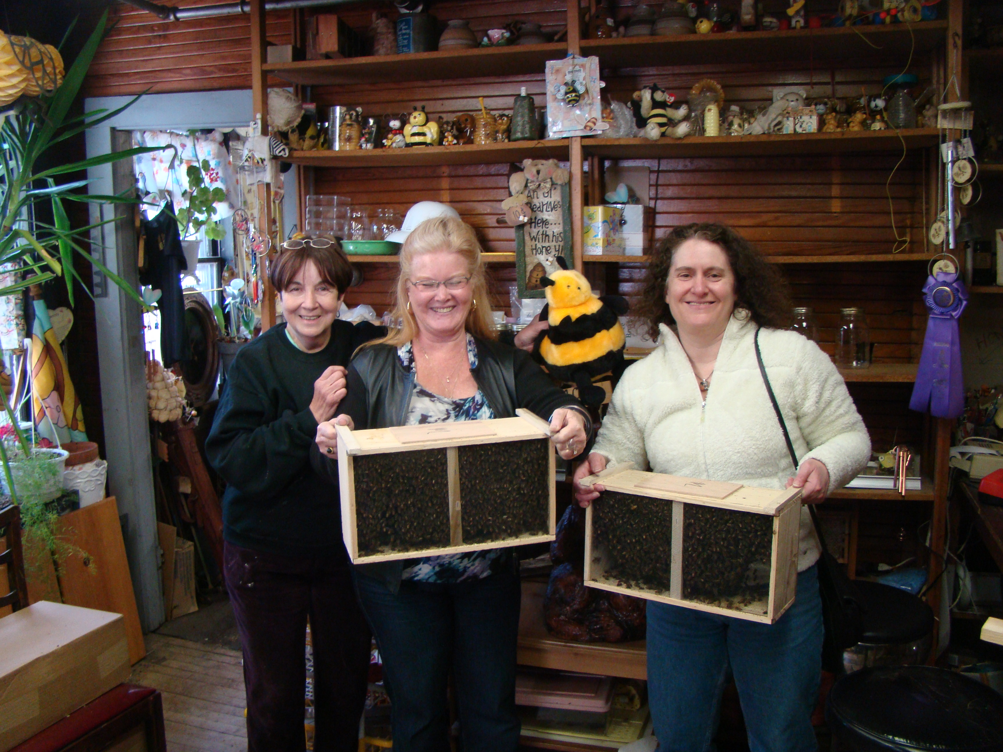 Next, we reviewed how to install the bees with Nancy. Just the idea of transfering the queen and then dumping 10,000 bees into the hive is intimidating, to say the least. Practice builds confidence. Nancy has empty equipment in her store, so we did some dry runs.