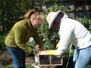 You may wonder, if you are starting a hive, how do you get the bees? They come in little wooden crate. The package contains a queen, some food, and three pounds of bees, that’s about 10,000 bees. Nancy, the beekeeper providing us with bees, had about 200 of these packages in her back storeroom at the Beekeepers’ Warehouse. The first thing Laury and I did was to check out this sight. It was amazing how quiet the room was. There was a very faint hum, but it was unexpectedly soothing, rather than creepy.