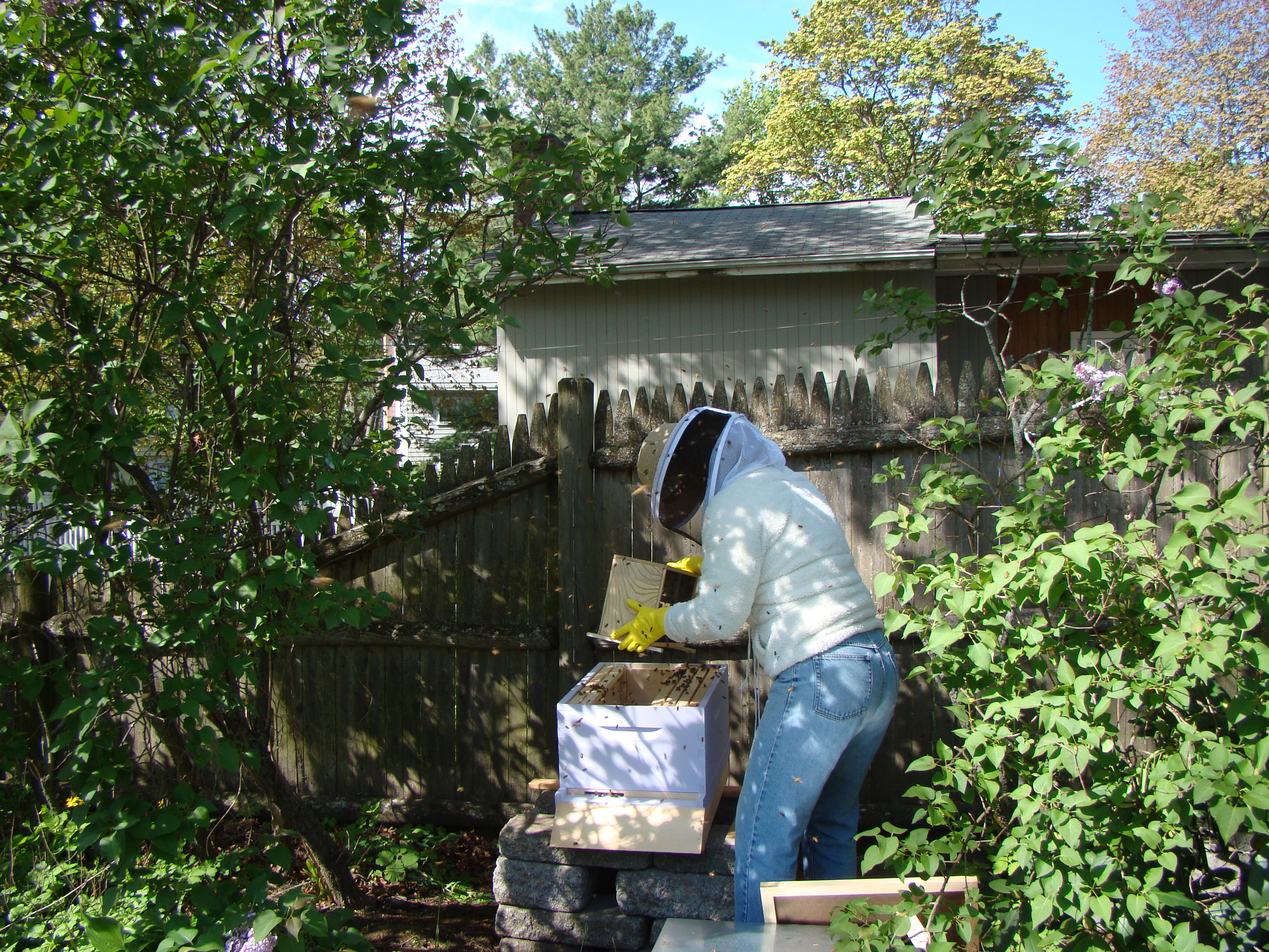 Saturday morning, the big day! I like to be prepared, so when I woke up, I watched a video of someone installing bees. Then, Howard helped me set up the hive itself, which I had built and painted, but hadn’t yet set in place. (I added the hive stand at the last minute, so unfortunately, it’s unpainted.) I got all the expected equipment at the ready, and when Laury came over, I brought the bees out from the basement and we got started. Laury helped tie me into the veil and hat, and I donned dishwashing gloves. Howard was designated the official photographer and caller of 911.