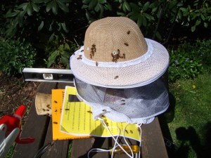 It has been fascinating to watch the hive come alive over the weekend. There is was a busy hum all day, then, at dusk, all the bees went inside and it beomes very quiet. I found myself spending time just sitting on the lawn and gazing, mesmerized, at the hive. It’s soothing rather than nerve-wracking. I’m also amazed how I was immediately comfortable with bees crawling on me. I even coaxed a few (like the ones that ended up inside the veil when I left it on the table) onto my finger to relocate them closer to the hive.