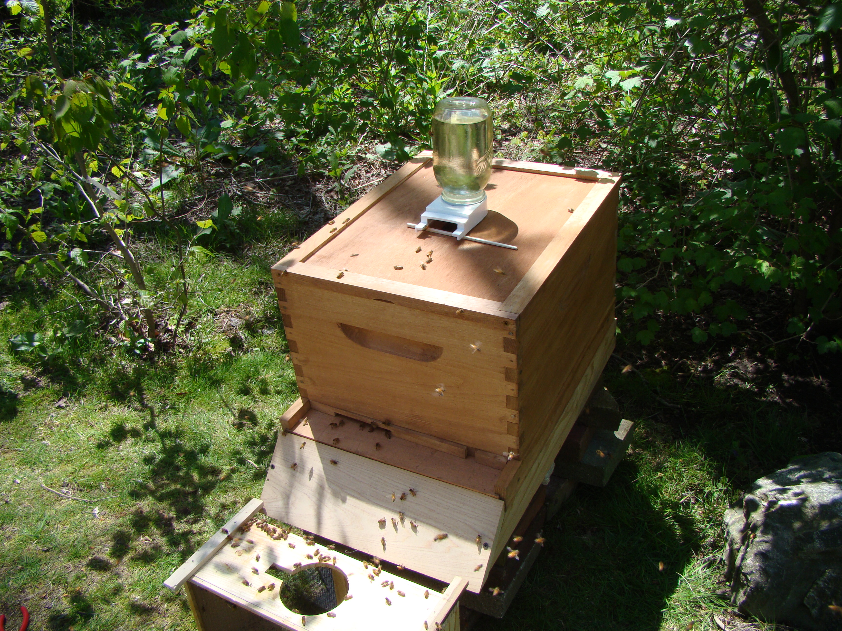 The last step was to place the feeder on top, enclose it with an empty hive body, and cover it all with the weatherproof lid.