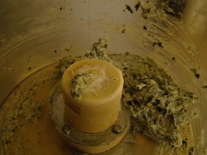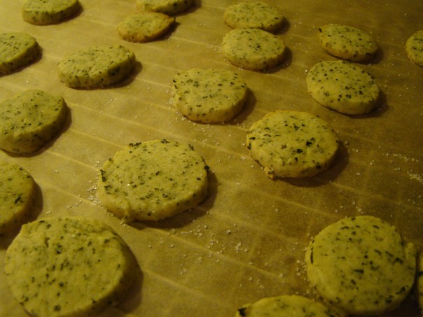 The process is similar to any slice-and-bake icebox cookie. The dough is mixed, rolled into logs, and chilled until firm. The twist here is the addition of chopped seaweed. I took a shortcut with the seaweed. I had some of a favorite Trader Joe’s snack, Roasted Seaweed, on hand, so I chopped a package of that in the mini-chopper, and cut back on the salt because the seaweed was already well salted.