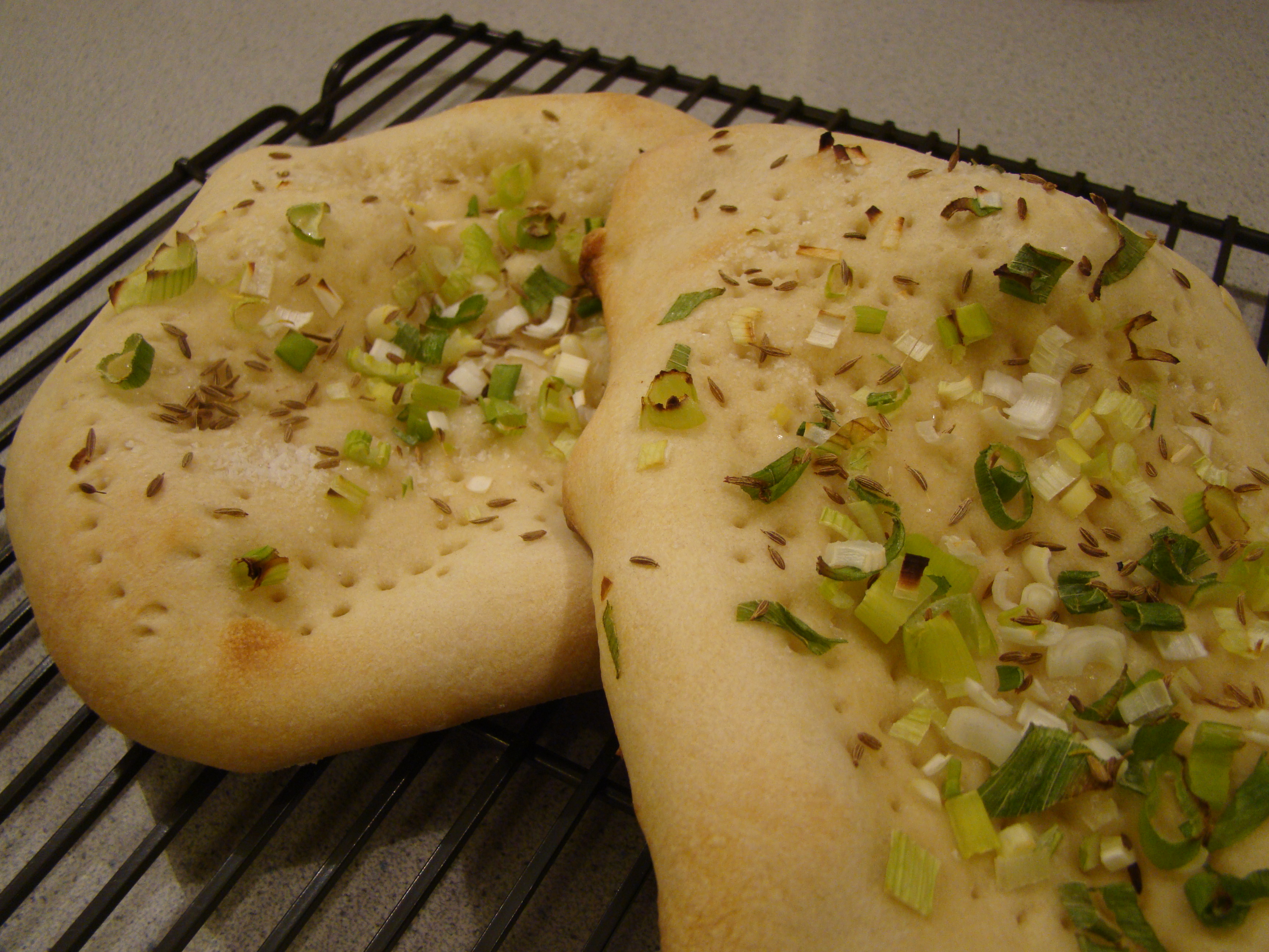 After work, first thing, I took the bowl out of the fridge to warm up. Then I put my pizza stone in the oven and let it heat up to a high temperature. The dough was divided and rolled between my hands into four balls. Then, with the rolling pin, I rolled the each ball into a 6-inch disk. Each disk was moistened, and then, “with determination”, I used a fork to prick the center of each one. Finally, I sprinkled each bread with kosher salt, chopped scallions, and some seeds. The recipe gave the option of cumin or caraway. I had both on hand, so, for the first round, I made one of each I preferred the cumin, so the last two were topped with cumin seeds.