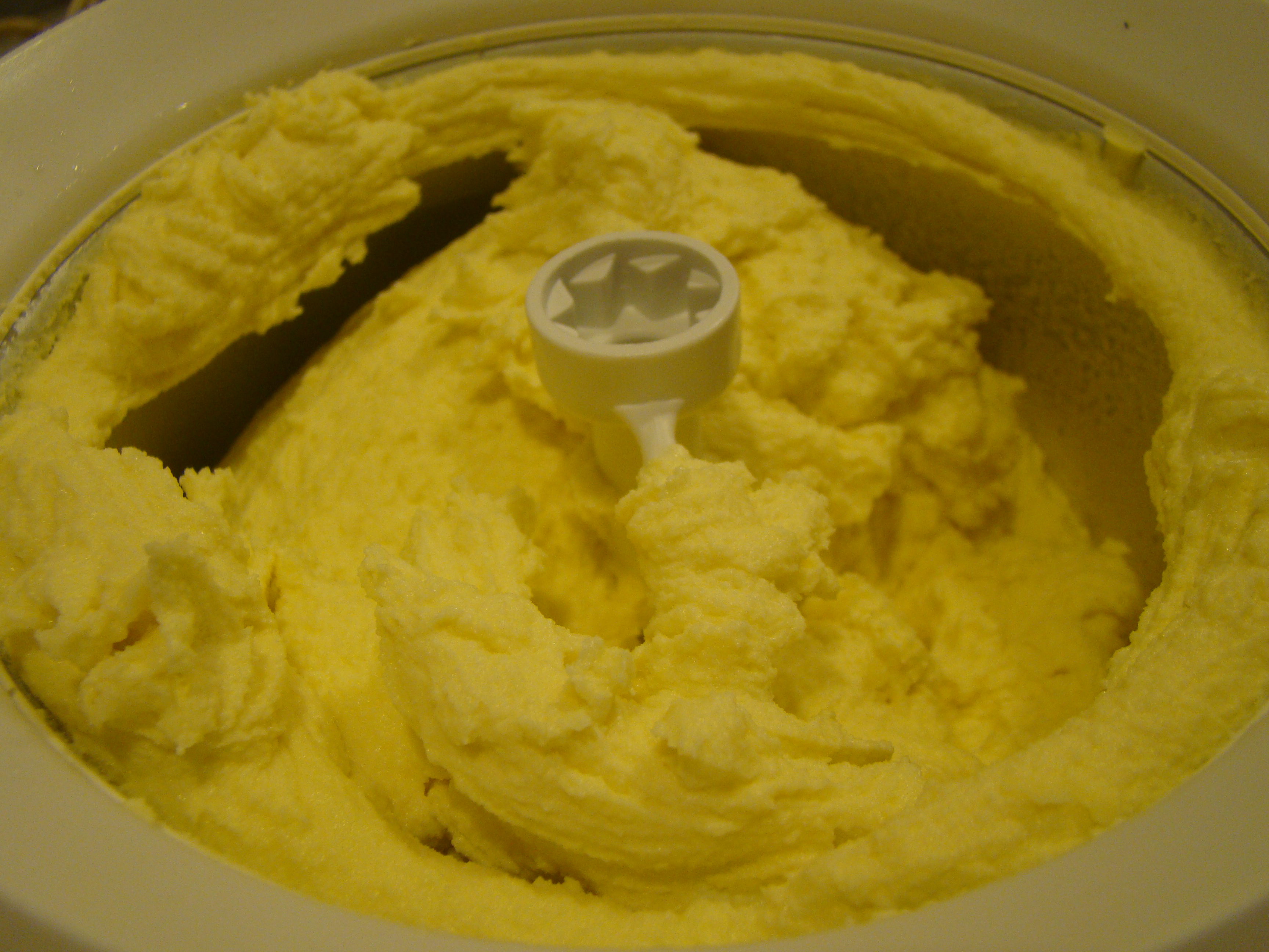 The ice cream maker made quick work of turning the custard into ice cream. It took about 25 minutes. I tasted it before freezing it to ripen and harden, and it was just like vanilla ice cream.