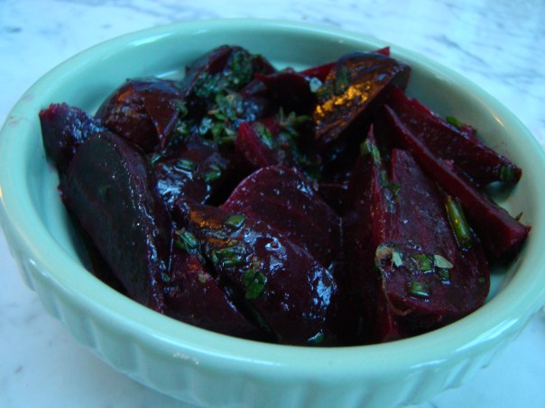 I prefer beets roasted to steamed, so that’s how I cooked them. After an hour in the oven, the skin usually slips right off, making a non-fuss preparation. Cookbooks always caution about the possibility of stained fingers when peeling the beets this way, but I’ve never had it happen.