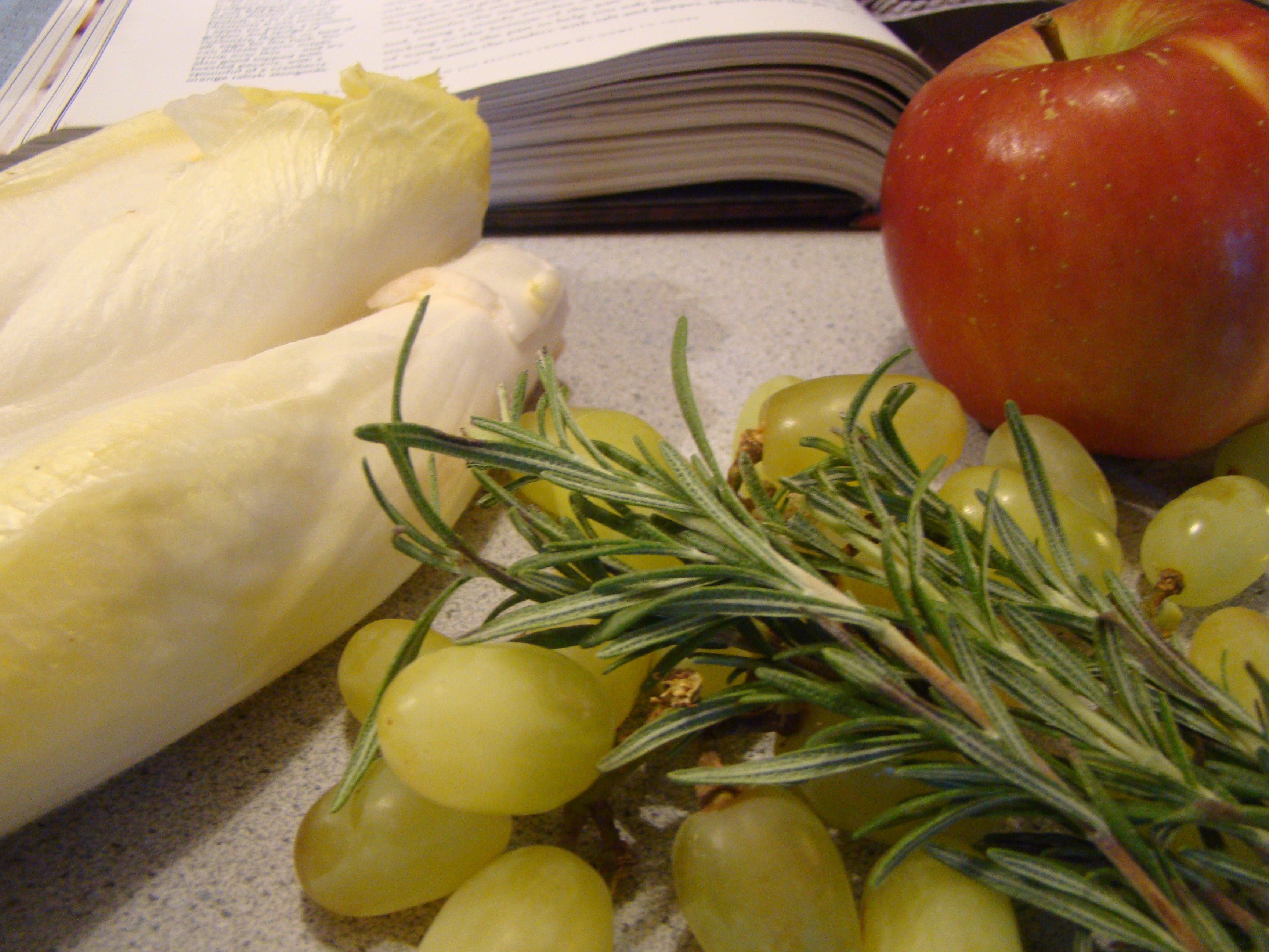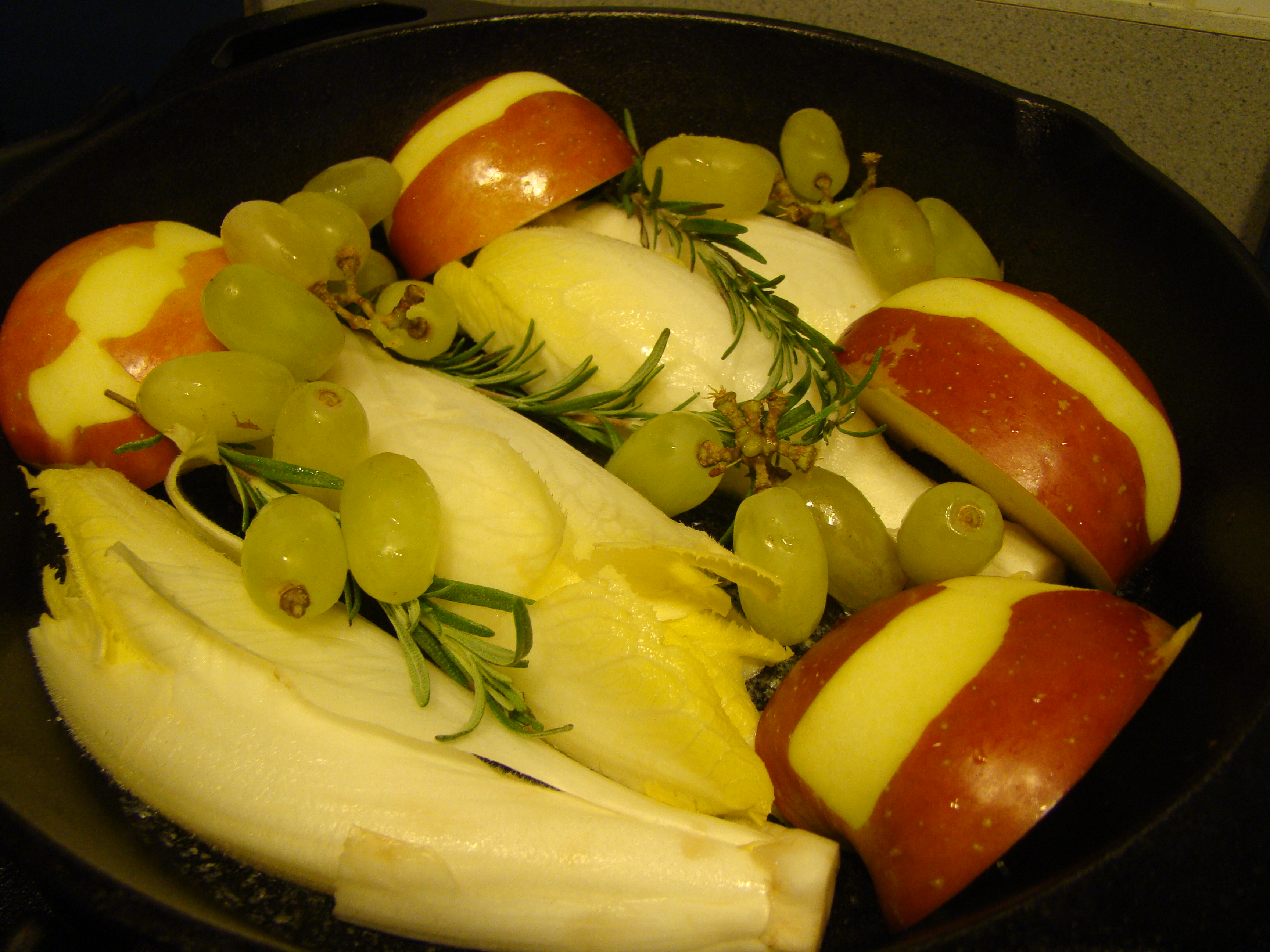 What about this week? I’ll admit that on paper, the recipe was uninspiring. Endives, are OK in salad, but eating them cooked, caramelized, no less, with fruit, seemed downright weird. I gave it a try. Endives, apples, grapes, rosemary braised in butter. The ingredients sit on the stove to caramelize, get flipped over, and the same is repeated on the other side. It really couldn’t have been easier.