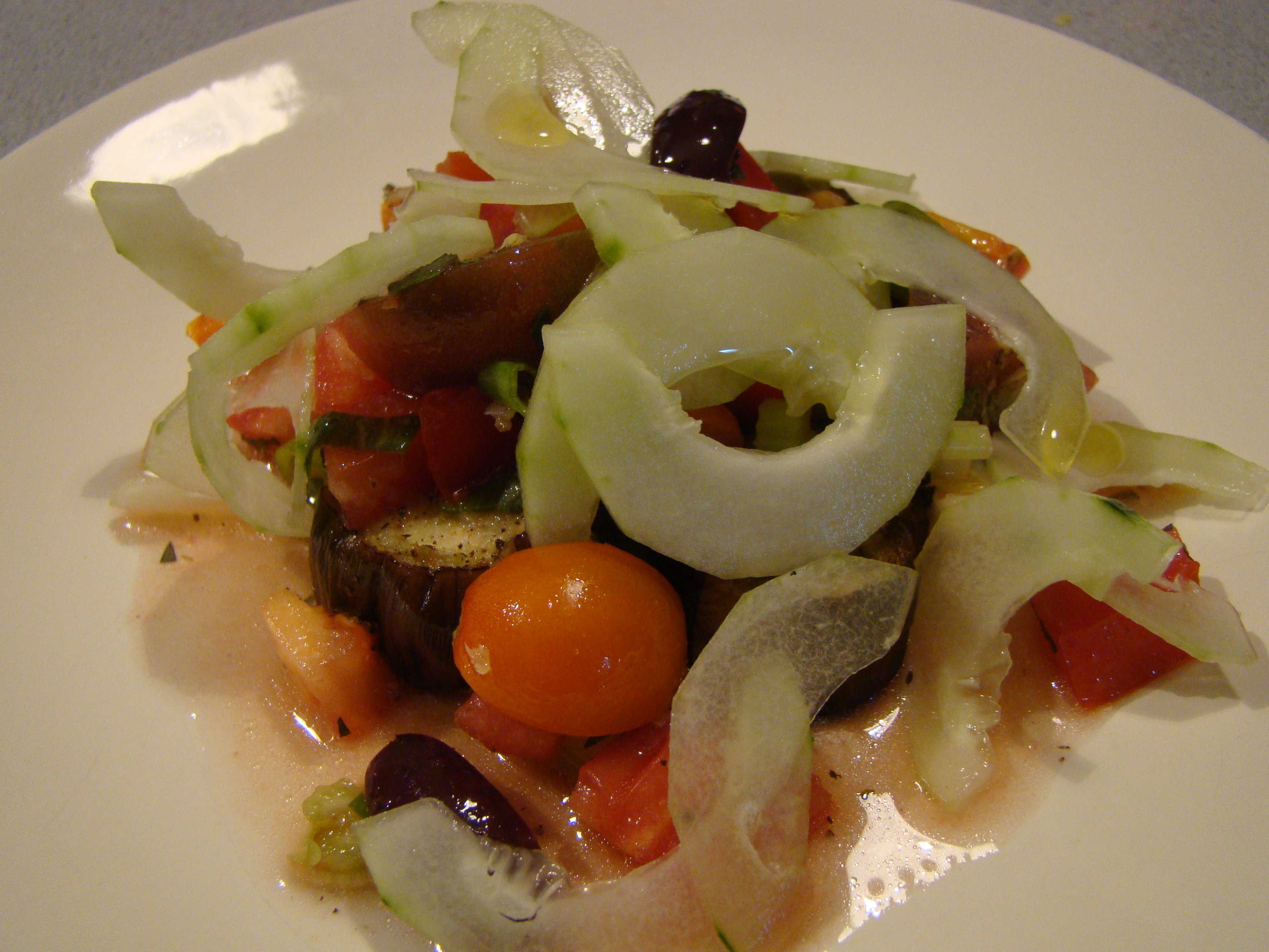 ffwD: eggplant “tartine” with tomatoes, olives, and cucumbers