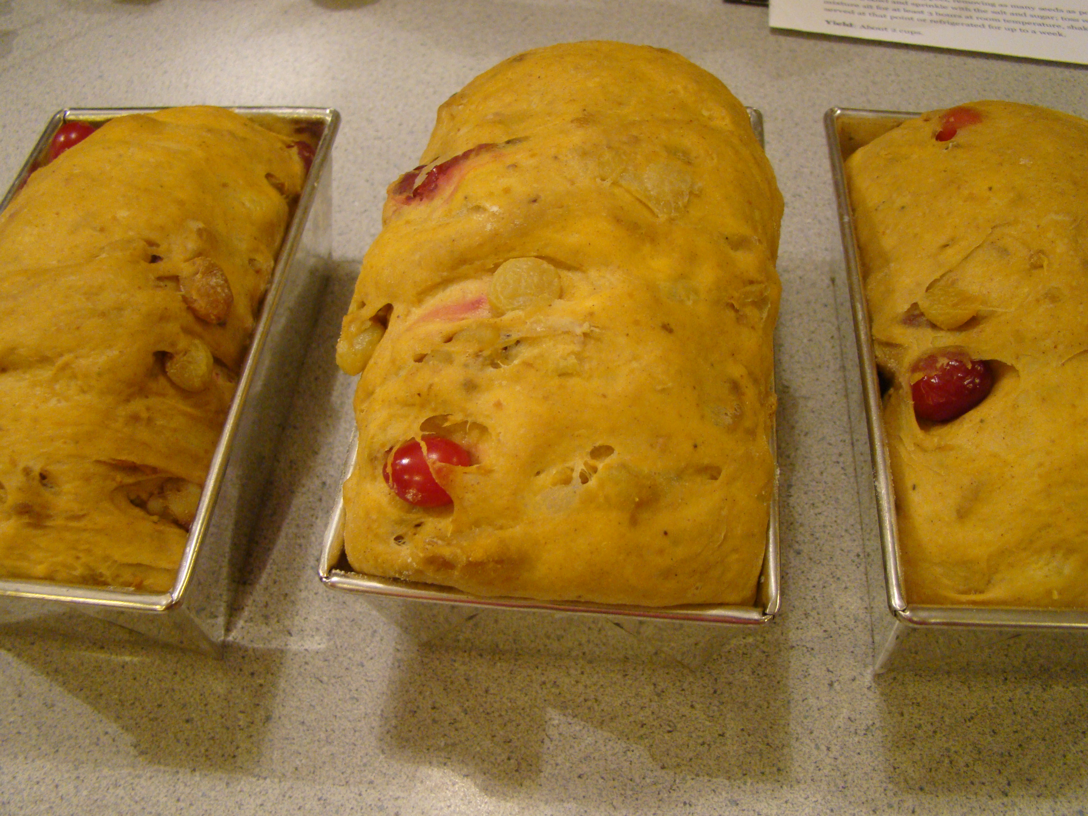 My verdict on this one? I absolutely love the texture of this bread. It’s moist and light and airy. The pumpkin’s flavor wasn’t noticeable, but I’m sure it added to the wonderful texture. I felt lukewarm about the cranberries. They dotted the loaves like rubies, which looked gorgeous, but tasted a bit too tart. Maybe I would have preferred dried cranberries, which are usually sweetened. I also like the smaller loaves, great for sharing.
