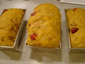 The pumpkin loaf dough is like an enhanced brioche, where the usual flour, yeast, salt and water are enriched by butter and egg (and, in this case, pumpkin as well). It was very sticky. I had some doubts that it would form a ball on the dough hook because after 10 minutes, it was still rather loose. The last five minutes worked its magic, producing the desired silky ball on the hook. Toasted walnuts, cranberries, and golden raisins were mixed in to stud the dough.