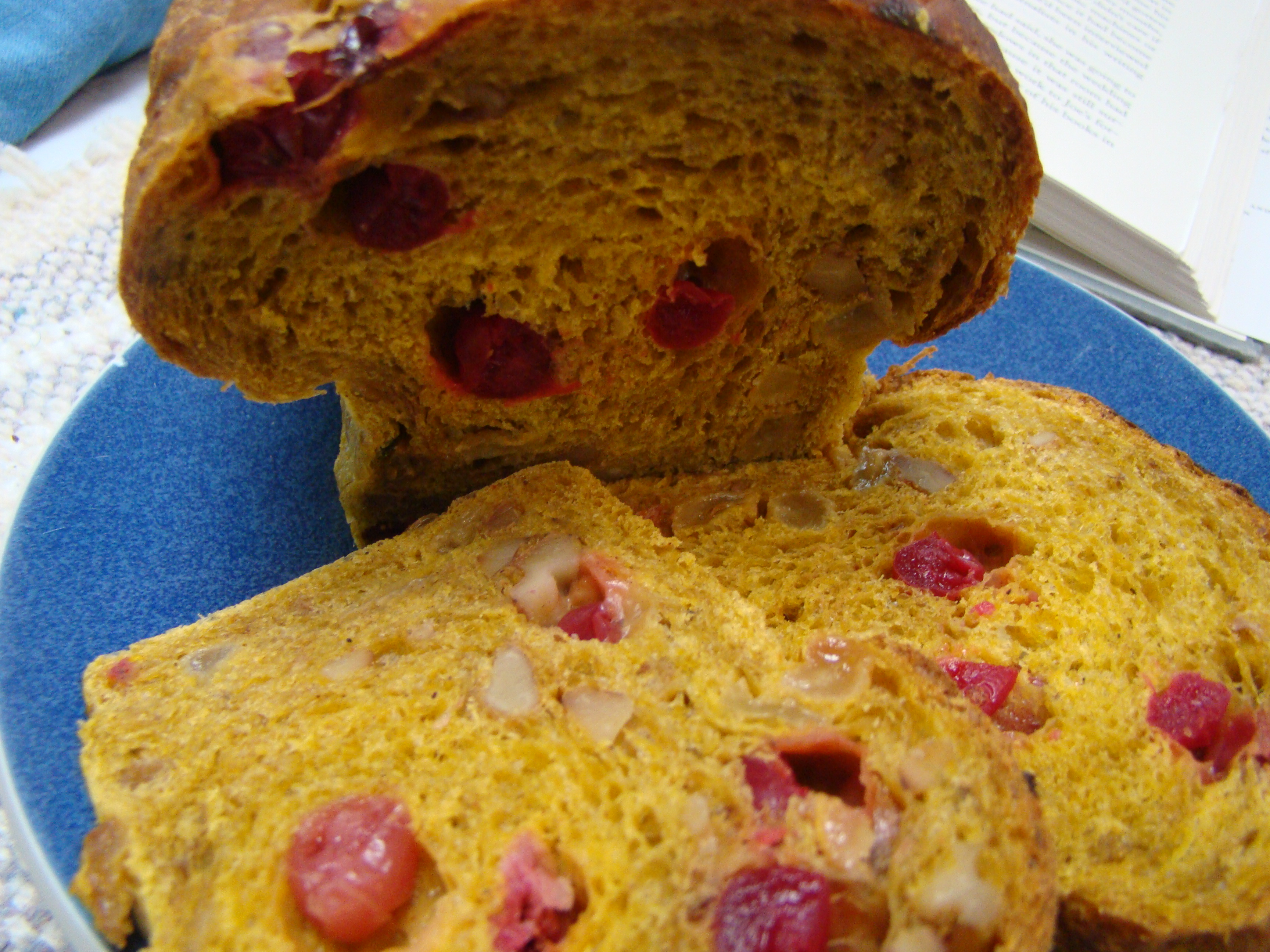 When I read the name of this autumnal recipe, I envisioned just another quick bread, so I wasn’t planning to make it. When I realized that it was a yeasted bread, I got more interested. Pumpkin in batter made me think of the Chart House’s Squaw Bread. Not that I ever figured out what was in it, but the memory drew me in.