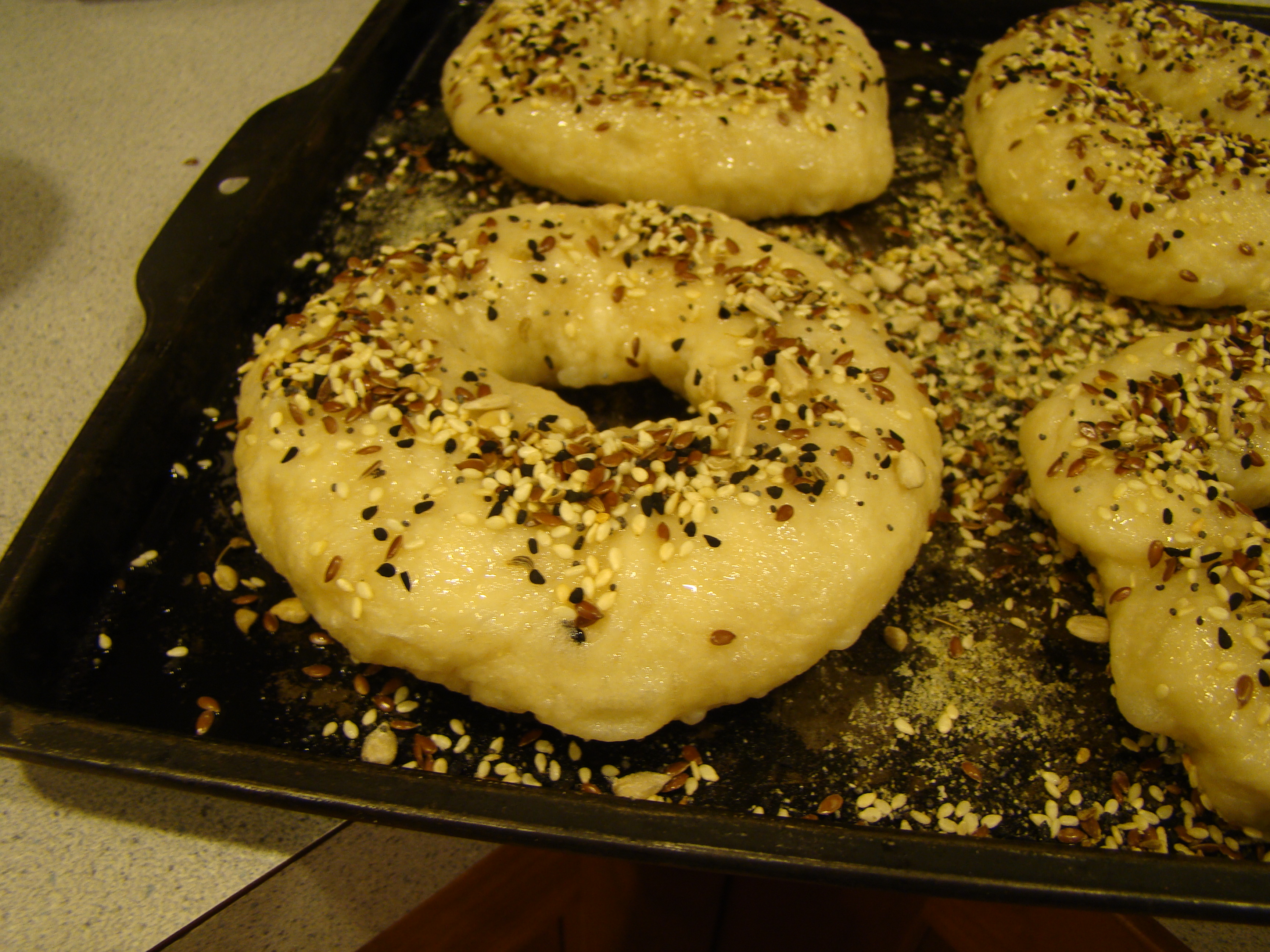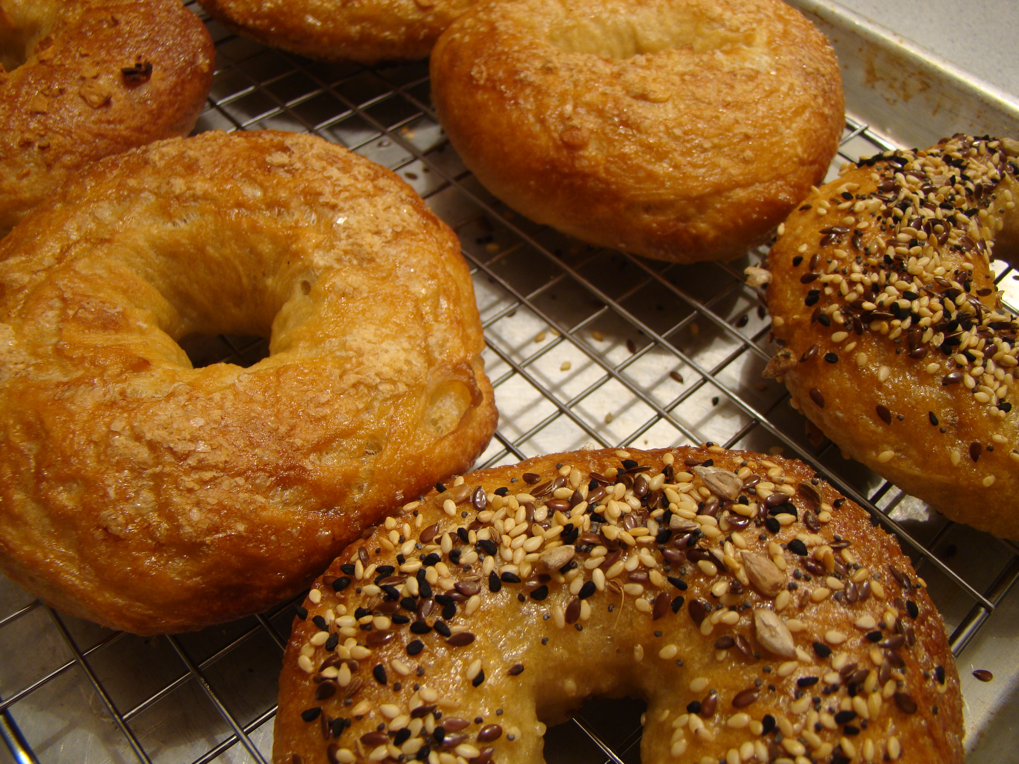 The bagels were boiled on both sides, then brushed with egg wash and sprinkled with toppings. The bagels are baked in a very hot oven, with ice cubes thrown on the oven floor to create steam.