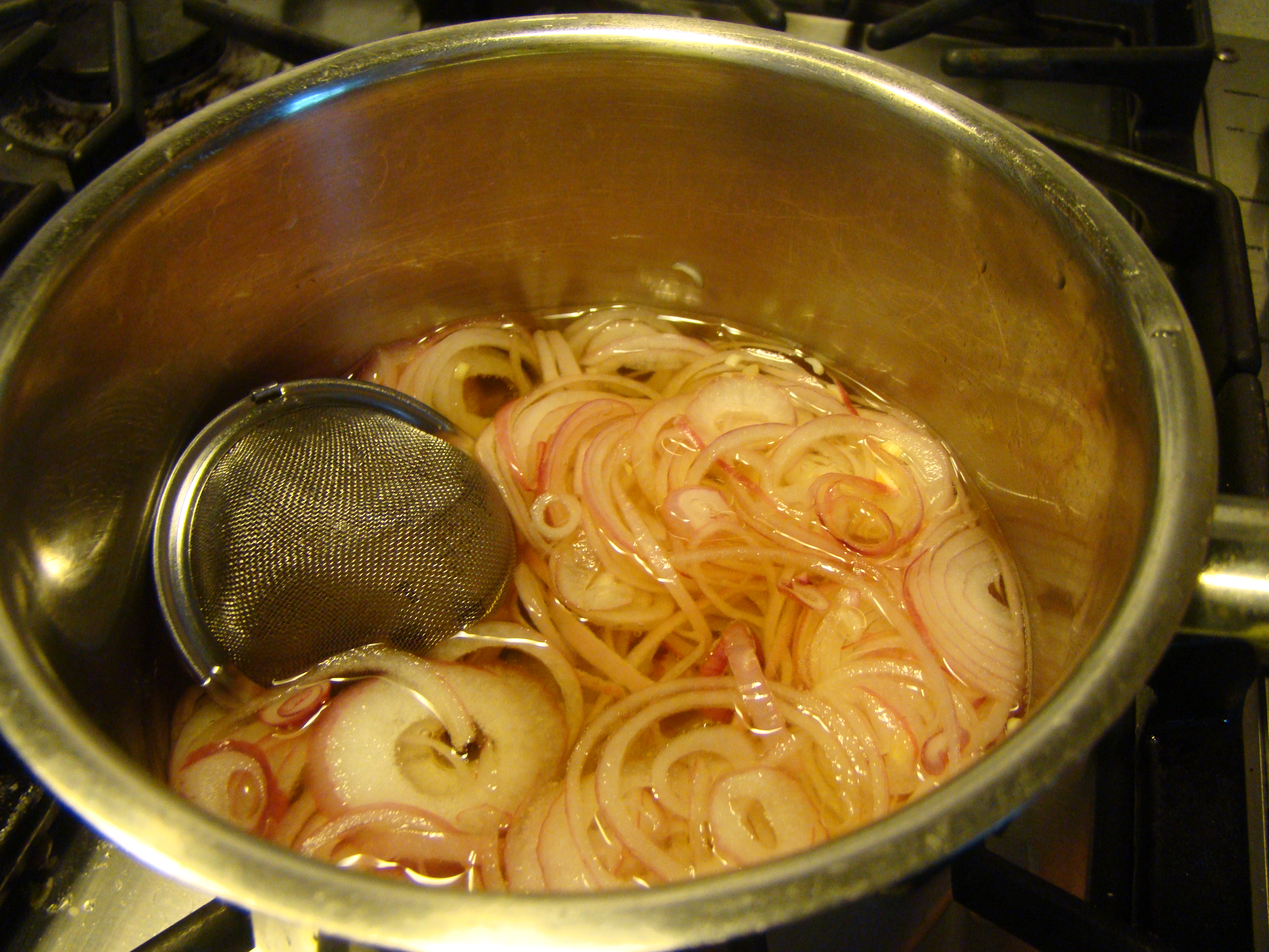 To start, for the pickled onions, you simmer thinly sliced onion in pickling brine for just 10 minutes. I used red onion which gave the brine a slight pink tinge. The spices in the brine were not very noticeable, though the sweet-sour tang of the onions was refreshing. Much more spice is needed.