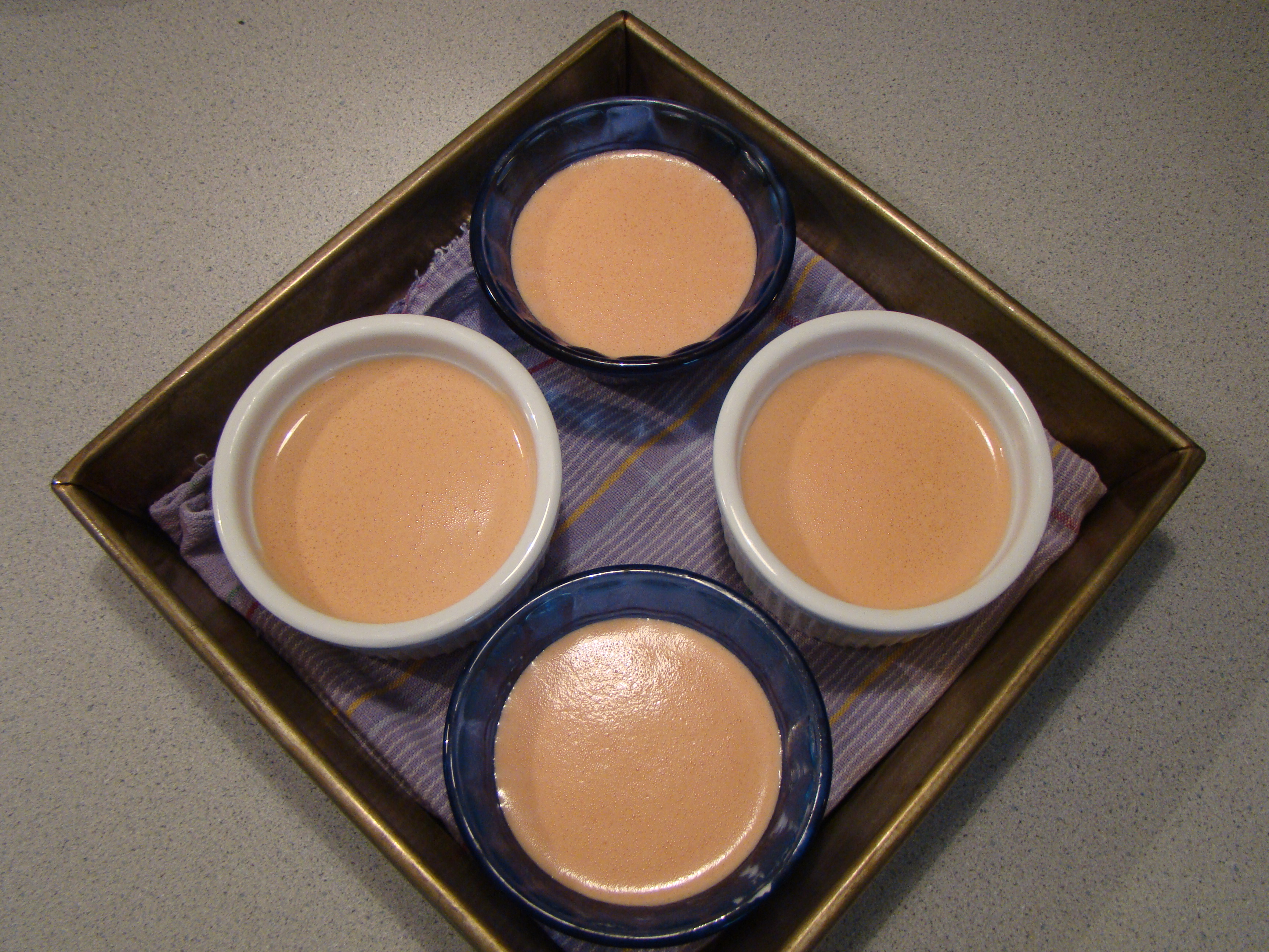 The liver is poured into waiting cups. I tried two different shapes for fun. While the traditional white ramekins were prettier in the cup, the straight sides made them harder to unmold. The ones in the custard cups didn’t look as elegant in the cup, but unmolded more easily and I preferred this shape on the plate.