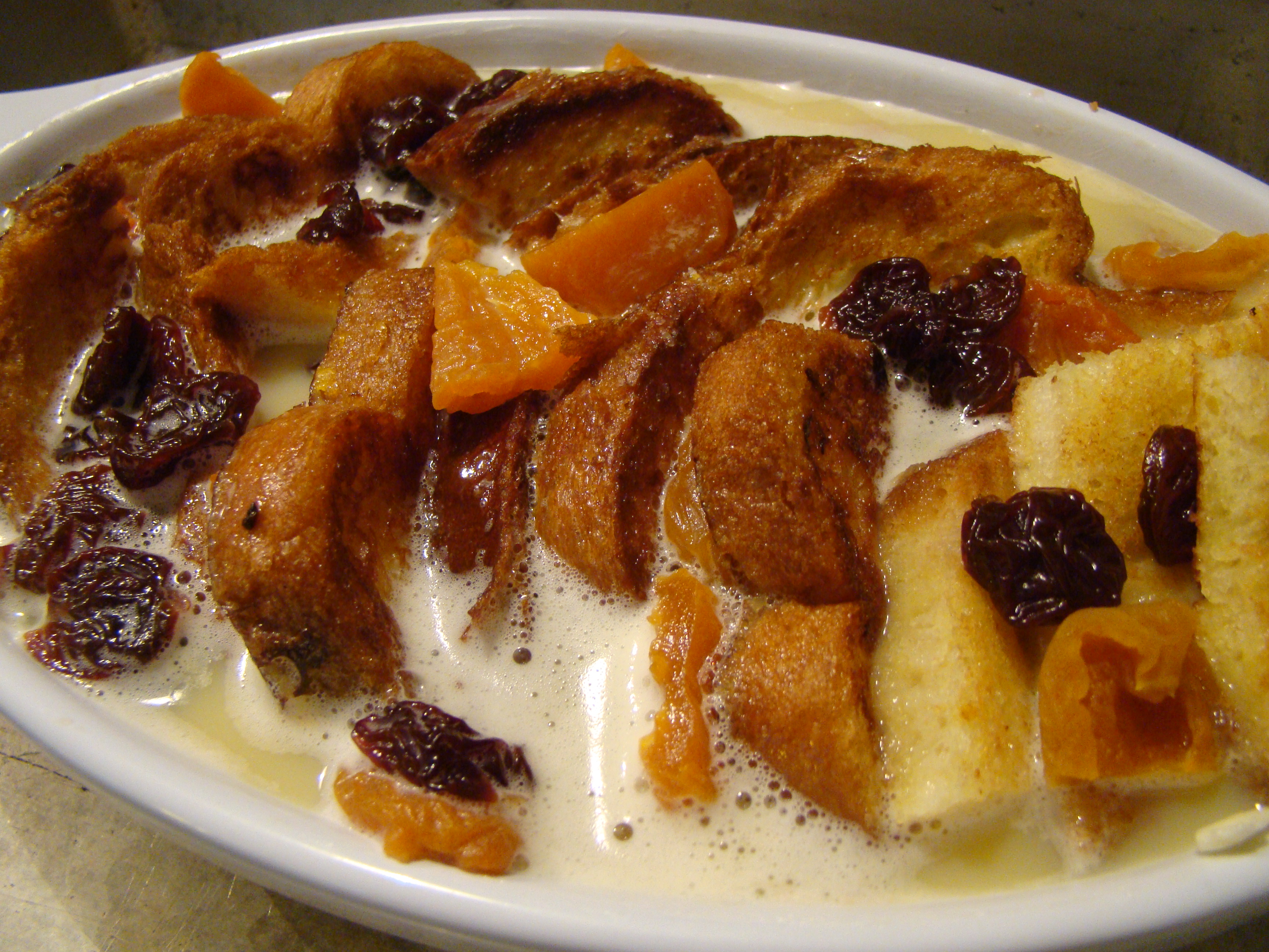 I really enjoyed this. It is perfect comfort food! The creamy bread and custard contrasted nicely with the slightly tart and chewy fruit bits. You could use prunes, raisin, or dried cranberries, whatever happens to be on hand. Any non-savory bread would work too (I can’t quite imagine seeds in this one.) Even though I might be eating alone, I would definitely make this one again.